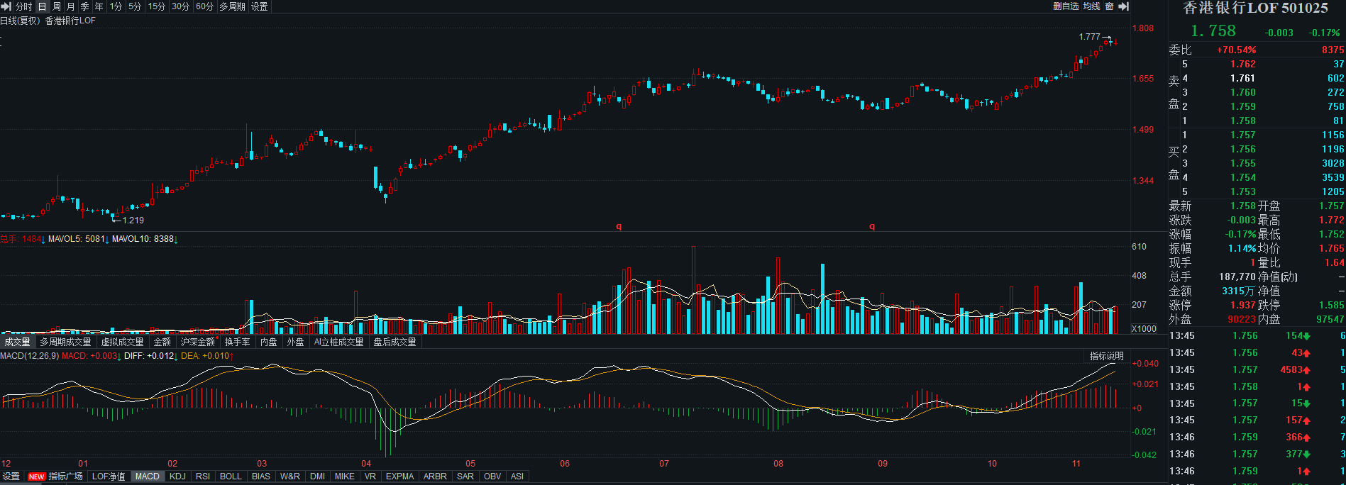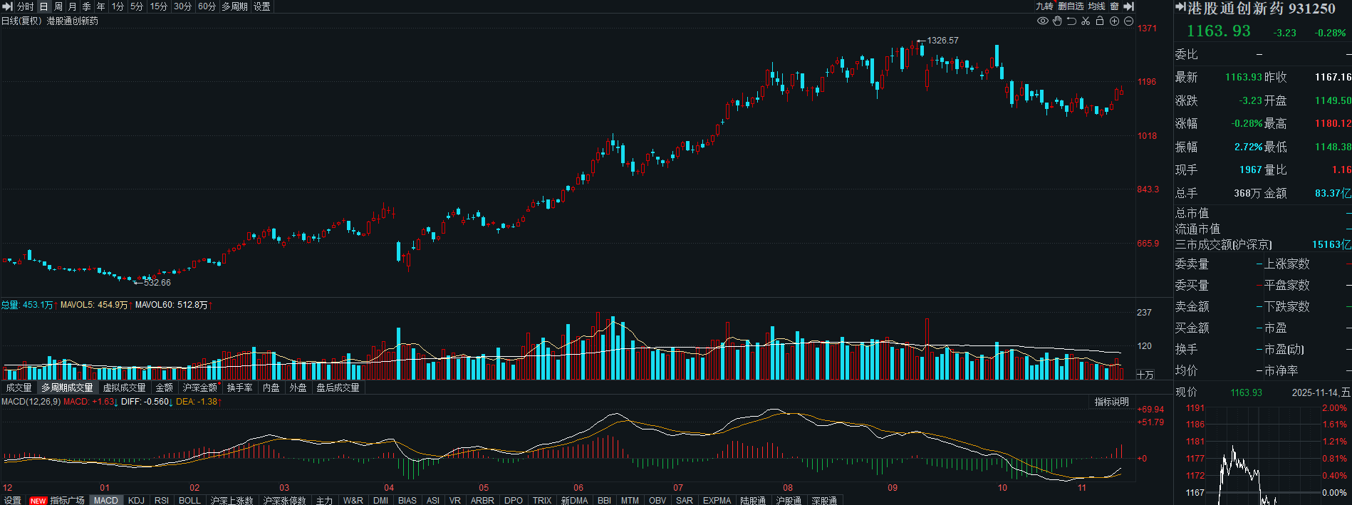 港股通创新药继续冲高,但今日的涨幅只能算是微微翻红,日k线站上5日均线支撑,附图MACD金叉向上,短期行情有望继续走强,关注60日均线的压力,只有强势突破60日均线,多头趋势才会正是确立,当下可以继续格局。