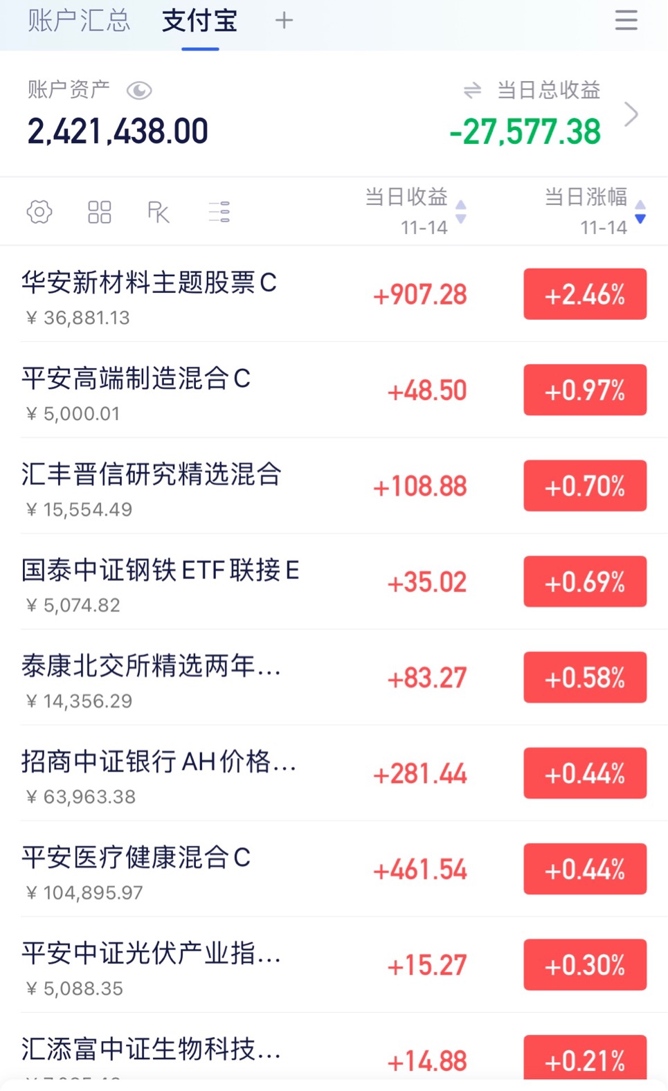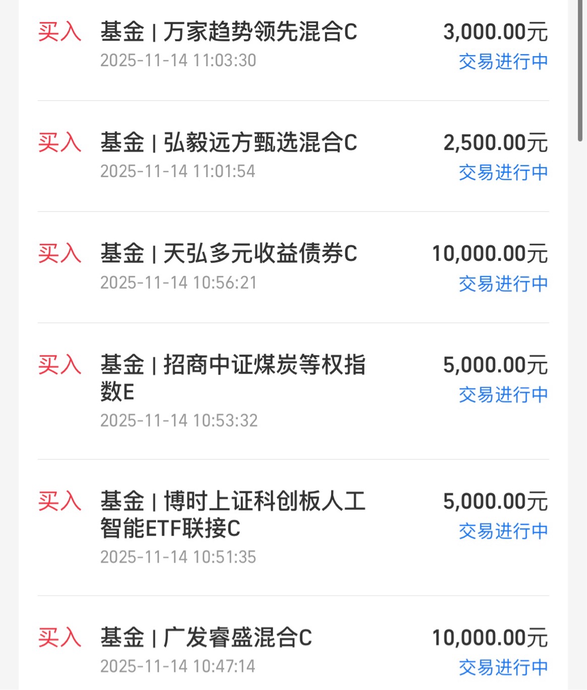 5. 有色金属,上车3000,$万家趋势领先混合C$ 这是一个专注于有色金属混合基金,从第三季度数据显示,主要涵盖两个方向,第一,黄金股票,第二,工业有色金属稀有金属,昨天上涨了3.83%,今天跌了1%,刚好逢低加仓