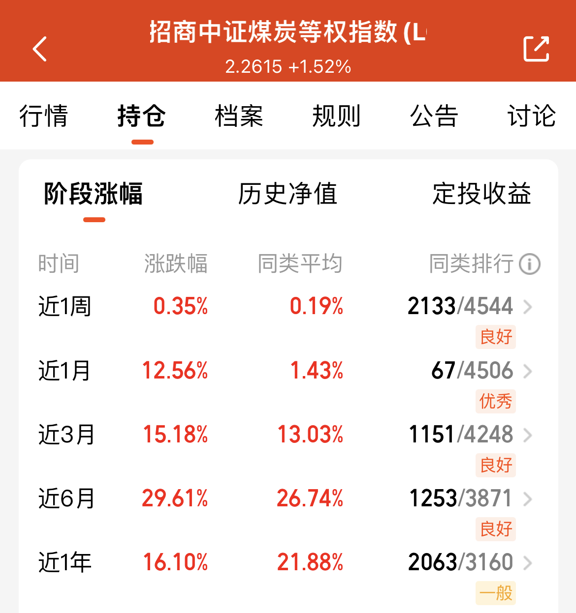 今天大盘震荡调整,三大指数集体收跌,创业板跌了1.67%,科技板块也跌了1.63%,不少板块都在调整。不过$招商中证煤炭等权指数(LOF)C(OTCFUND|013596)$挺给力,今天估值涨了0.16%,近一个月涨幅12.56%,近半年涨幅超29%,业绩表现也优秀。眼看冬天要来了,四季度煤炭需求肯定会涨,北方供暖、冷冬都得用煤,而且现在煤炭板块估值也不高,我也分批布局起来,相信后期必能收获满满。
