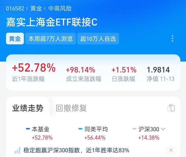 当前黄金兼具避险与抗通胀属性,我看好长期投资价值,沪金主连虽小幅波动但整体稳健。我最近入手的$嘉实上海金ETF联接C$ 跟踪精准,近1年收益可观,收益率达到了52.78%,是配置黄金一个不错的选择。而且持有人还有专属福利来袭:持仓100元以上领0.58元红包,1000元以上领0.88元,活动周度更新,本周上车即享,没领到的下周可再试,非常不错呢