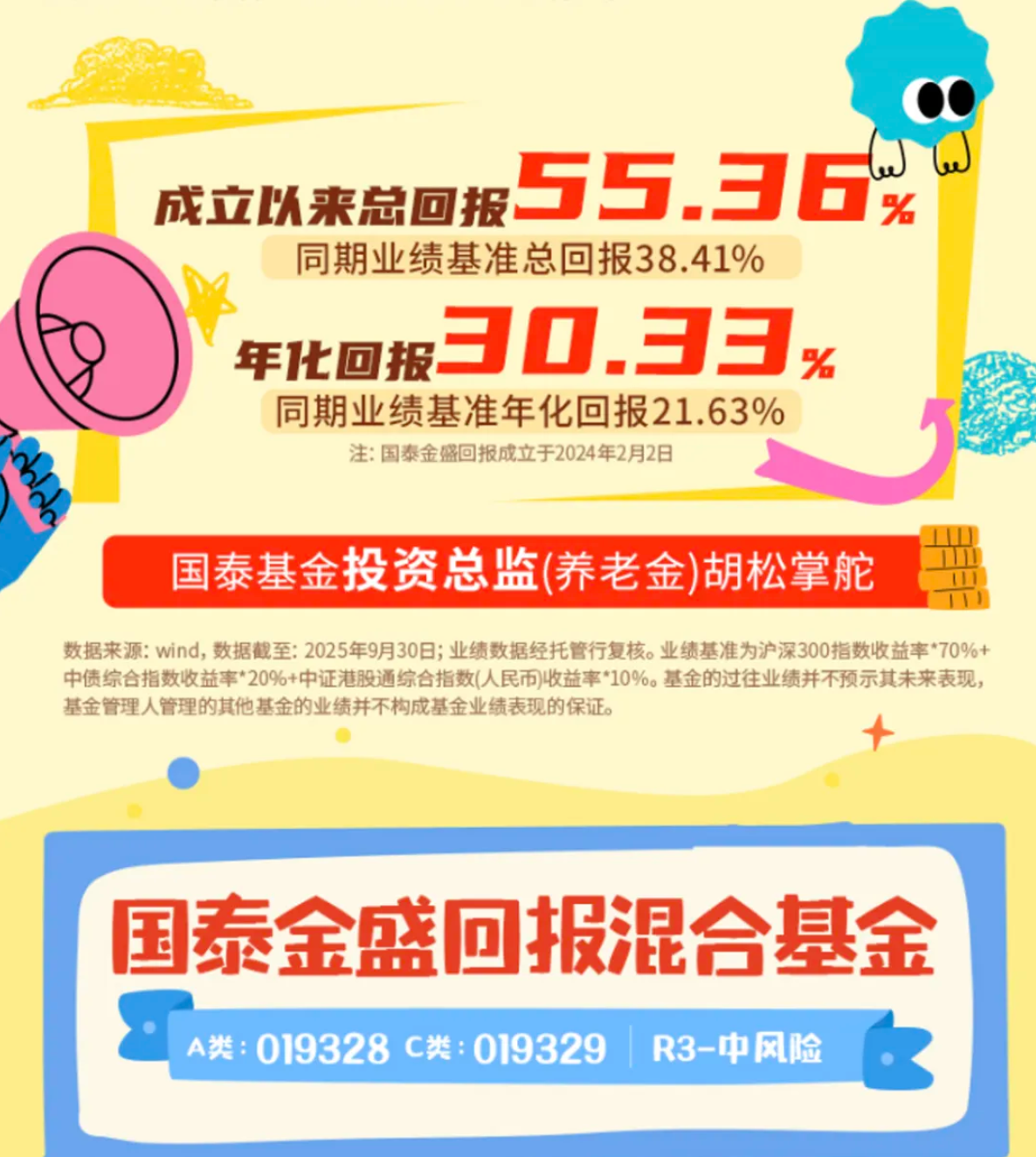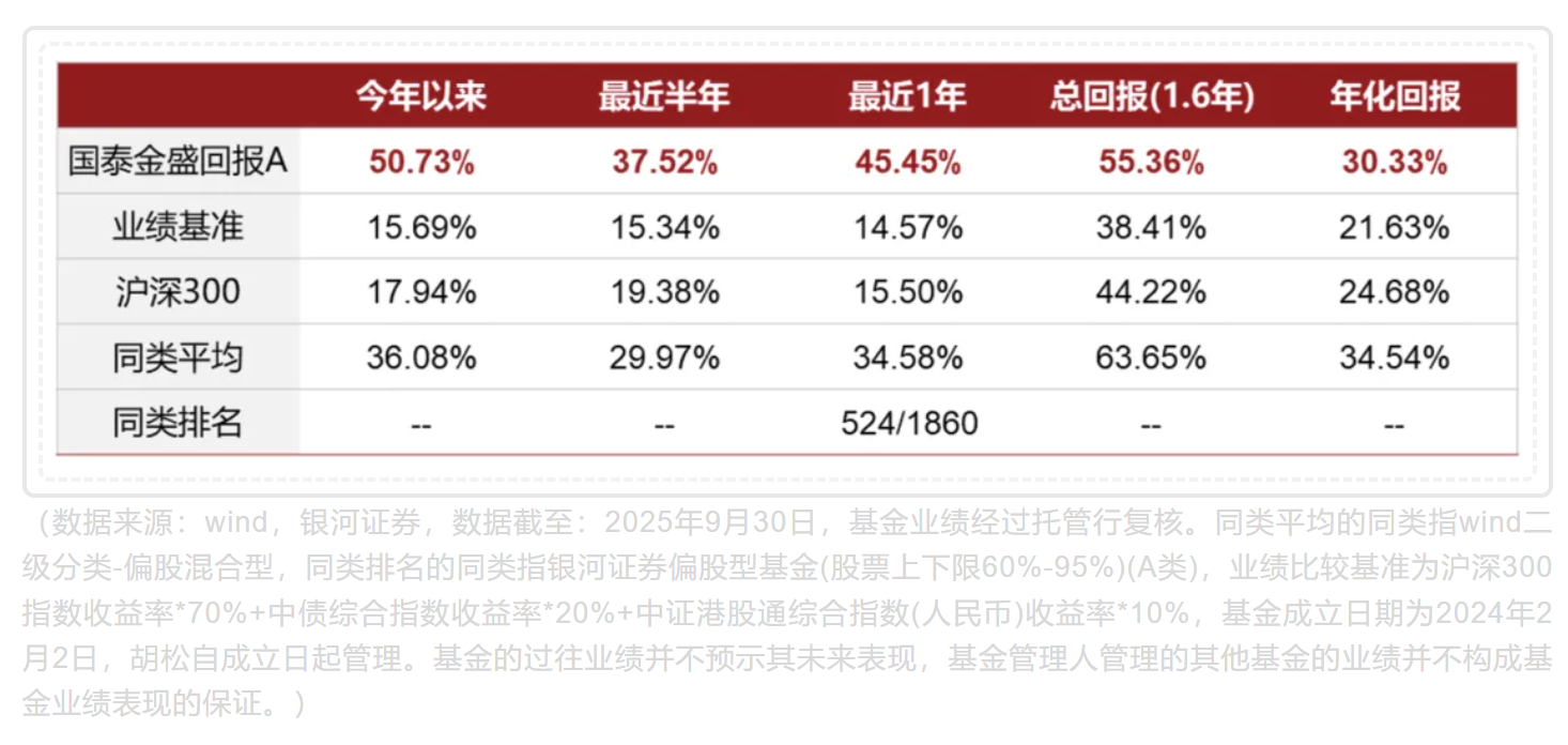数据来源:wind、国泰基金整理,数据截至:2025年9月30日,基金业绩经托管行复核,国泰金鹏蓝筹价值混合型证券投资基金(成立日期2006/09/29,业绩比较基准为60%*富时中国A股蓝筹价值100+40%*中证全债(全价),胡松自2020/09/25管理至今)2020年-2025年上半年的业绩/比较基准57.41%/13.79%,21.35%/-4.19%,-19.25%/-10.62%,1.13%/-2.44%,8.65%/13.60%,6.75%/0.42%。数据来源:基金定期报告,数据截至2025/6/30。国泰金盛回报混合A(成立日期2024/02/02,业绩比较基准为沪深300指数收益率*70%+中债综合指数收益率*20%+中证港股通综合指数(人民币)收益率*10%,胡松自2024/02/02管理至今)2024-2025年上半年业绩/比较基准:3.07%/19.66%,19.02%/1.80%。以上数据来源于基金定期报告。基金的过往业绩并不预示其未来表现,基金管理人管理的其他基金的业绩并不构成基金业绩表现的保证。风险提示:基金有风险,投资须谨慎。本基金由国泰基金发行与管理,基金的过往业绩并不预示其未来表现,基金管理人管理的其他基金的业绩并不构成基金业绩表现的保证。本基金管理人承诺以诚实信用、勤勉尽责的原则管理和运用基金资产,但不保证基金一定盈利,也不保证最低收益。本基金为混合型基金,预期风险与预期收益水平低于股票型基金,高于债券型基金和货币市场基金。本基金投资港股通标的股票时,会面临港股通机制下因投资环境、投资标的、市场制度以及交易规则等差异带来的特有风险。投资有风险,投资者在进行投资决策前,应仔细阅读本基金法律文件,充分考虑自身风险承受能力谨慎投资。