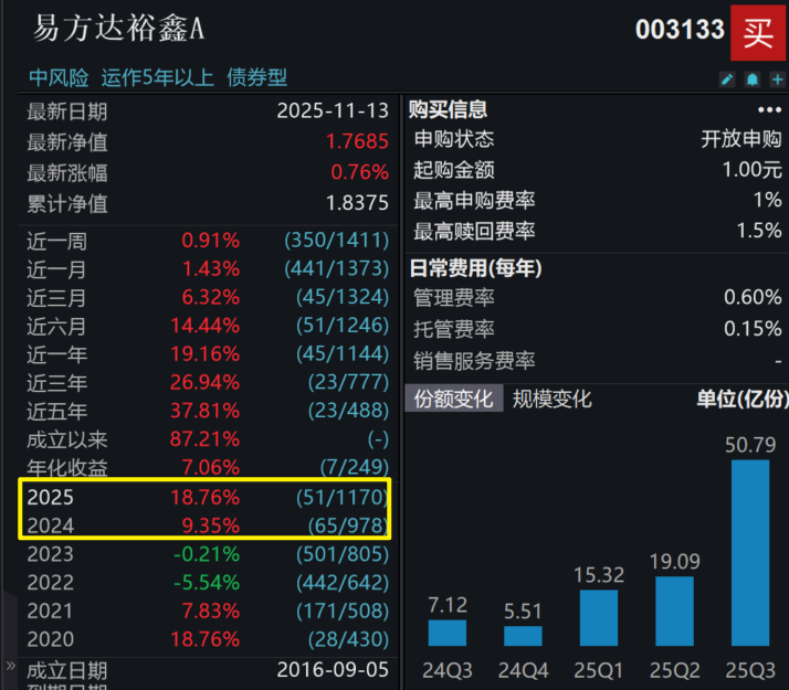 我个人储备的产品之一,是易方达裕鑫A(003133),其实之前就介绍过,基金经理是23年任职的,应该是这两年市场里,转债仓位相对较高,且业绩稳定性最好的偏债混产品之一,今年所以规模也上得比较快,机构端认可度是比较高的,弹性品种。