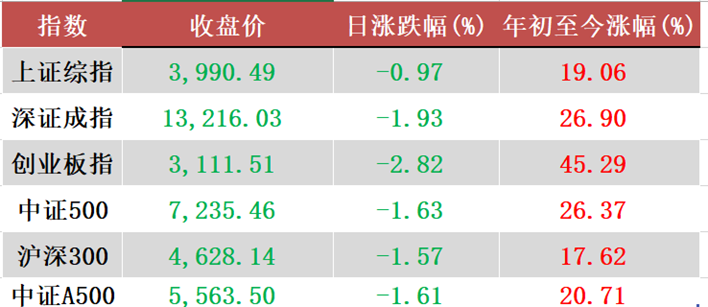 国内主要股指普跌。截至收盘,上证指数跌0.97%,收报3990.49点;深成指跌1.93%,报13216.03点;创业板指数跌2.82%,收报3111.51点。两市成交额19580亿元。行业方面,申万一级涨少跌多,综合领涨,涨幅为1.58%;电子领跌,跌幅为3.09%。