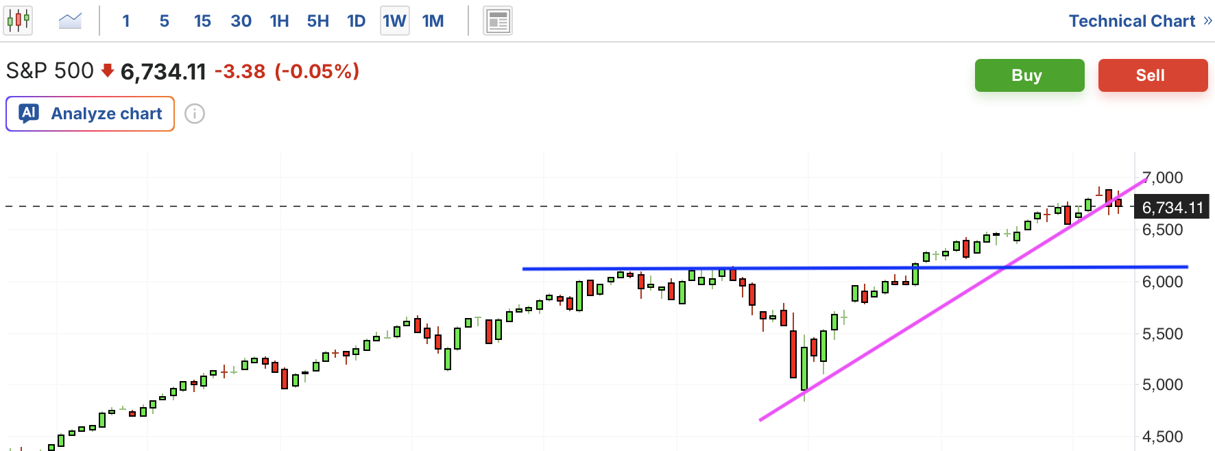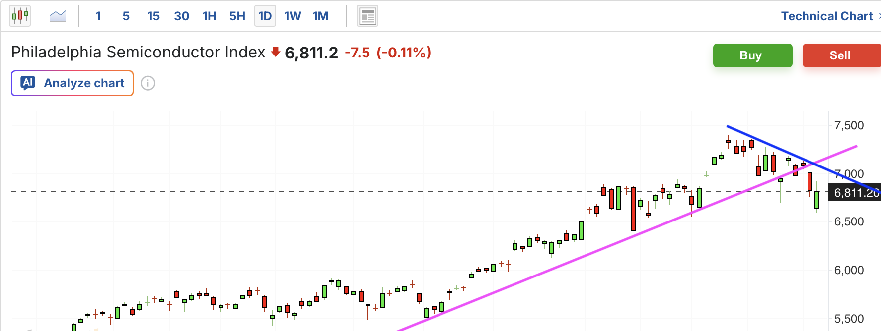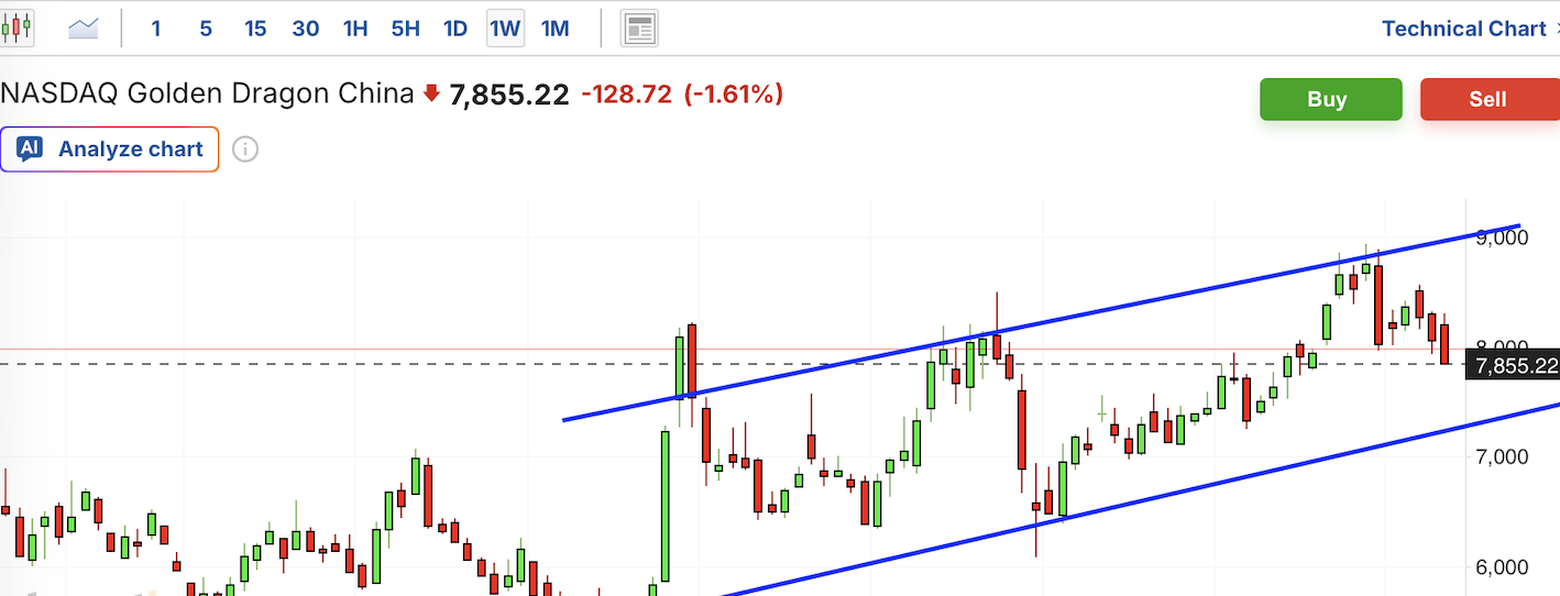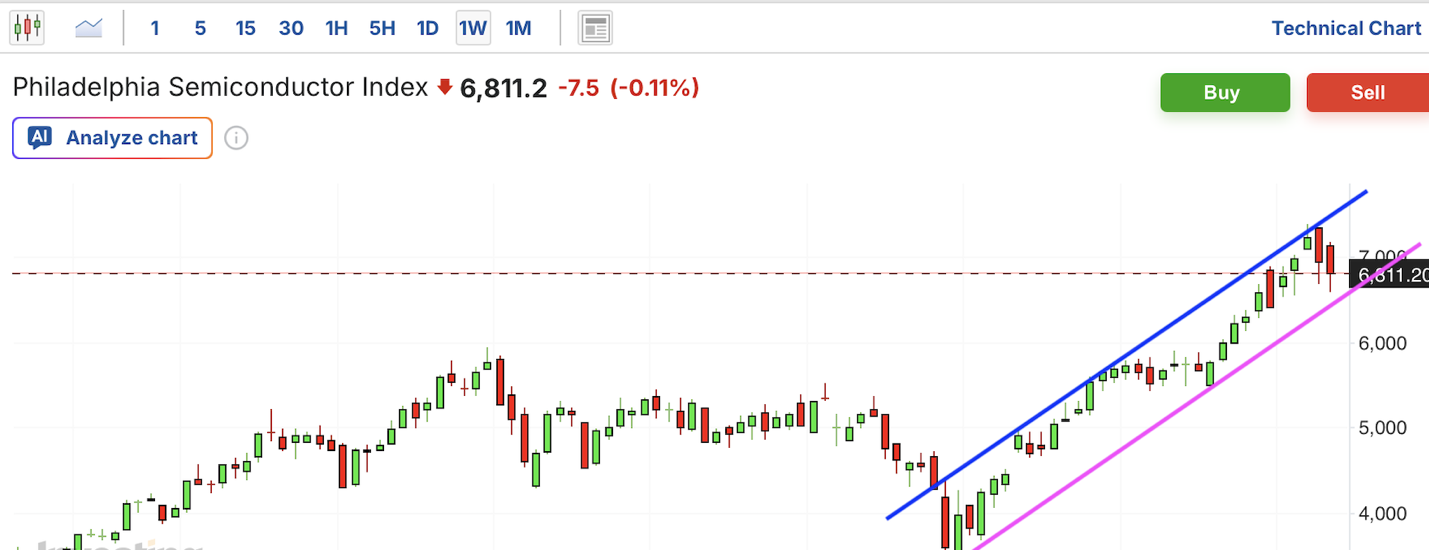 费城半导体近期大幅飙升,最近力竭回调,本周暴跌,跌破短期上涨趋势线;从中期看,目前仍在上升通道中,当前距离支撑位仍下行空间。