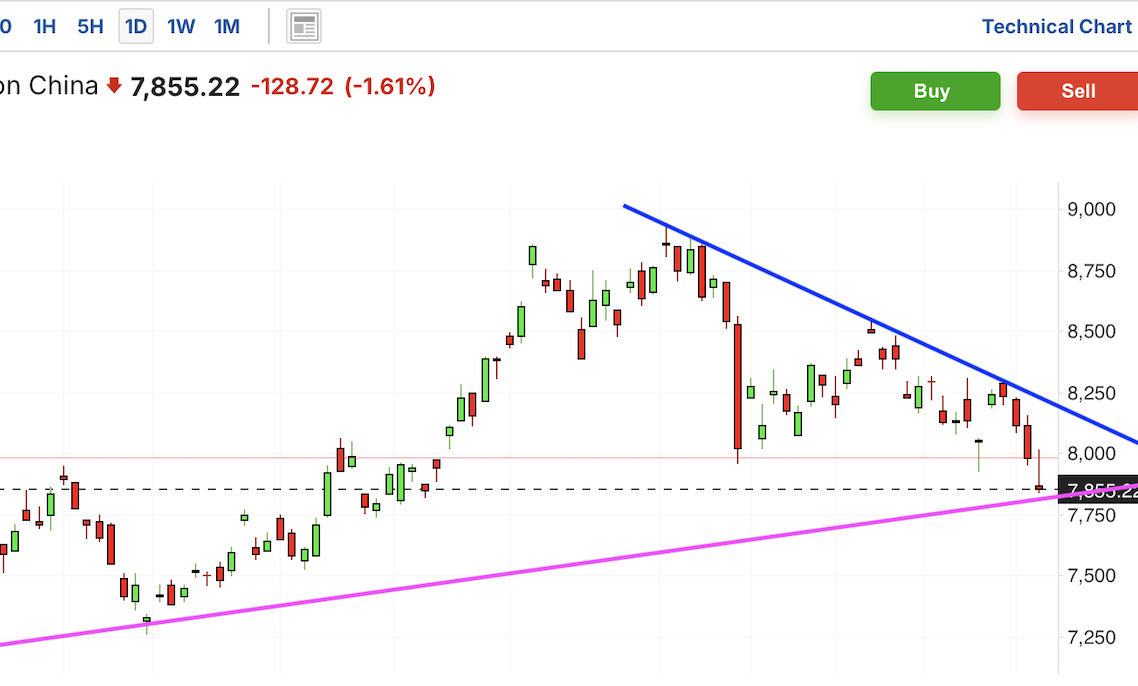 中概股此前受阻于压力位并回落,跌破短期上涨趋势线和前低支撑位,趋势已经下行。目前跌至第一道支撑,如果跌破,那么距离下一支撑位还有较大下行空间。