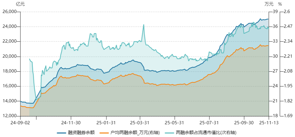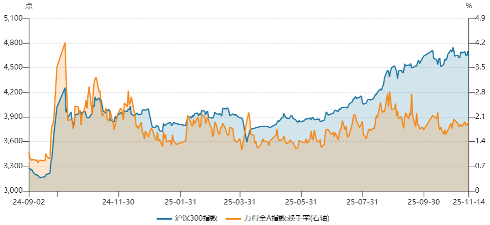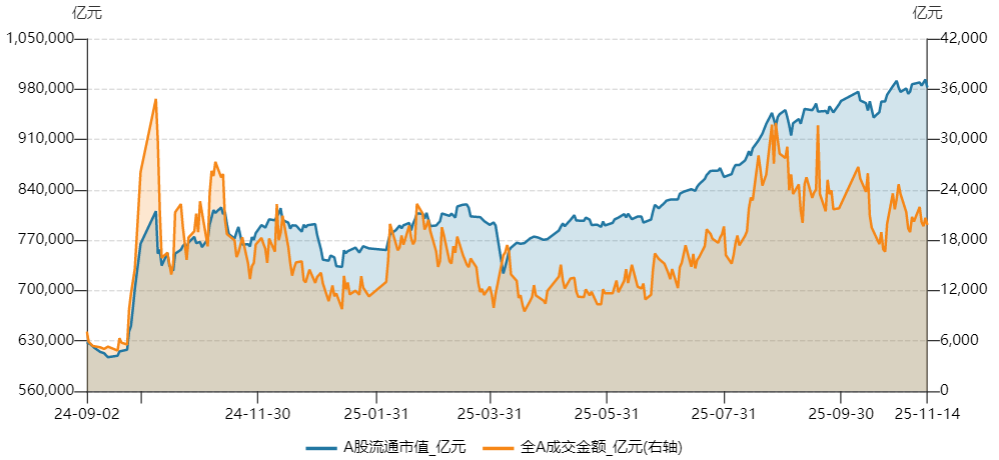 再看一些情绪指标。两融余额在10月29日创下25066亿的小高点之后,最近两周变化不大,甚至本周四11月13日还无限迫近前高(25065亿)。还是那句话,杠杆资金整体离场意愿不强,还是打算继续头铁留在场内。