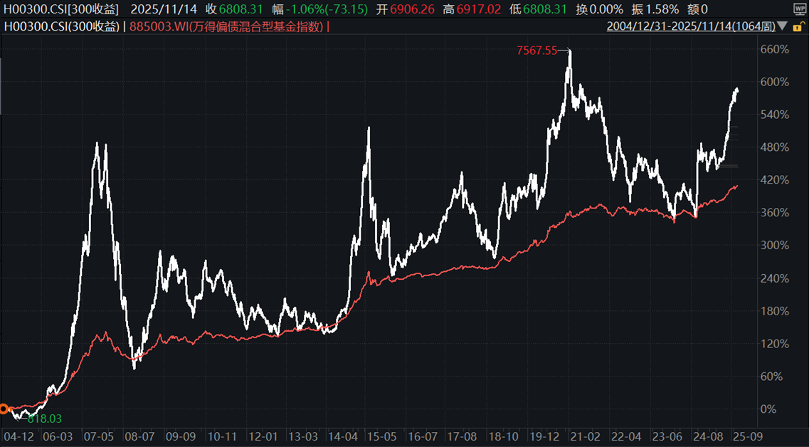 选这个时间点同样也是因为,第一,这是偏股基金指数的基日;第二,2007年底大盘处在历史高位,用这个起点作为历史高位的标尺也比较合适。可以看到15、21年两个高点都比一级混债指数略高一些,如果把比较起点再往前推些,推到更接近2007年高点的位置,或许后续的两次顶部也会更接近一级债基指数的累计收益曲线。