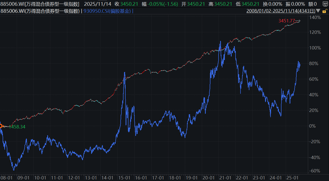 这个指标也是@张翼轸EarlETF老师改编自雪球用户@qzy69,从2007年12月31日开始比较偏股基金指数和万得一级债基指数的累计收益。