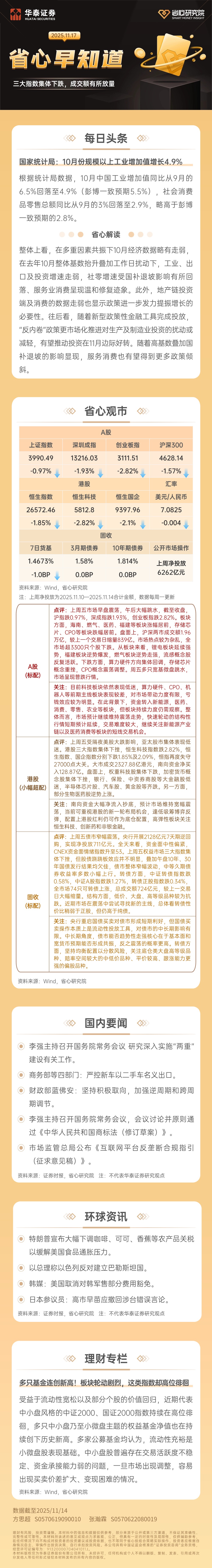1117 省心早知道——三大指数集体下跌,成交额有所放量