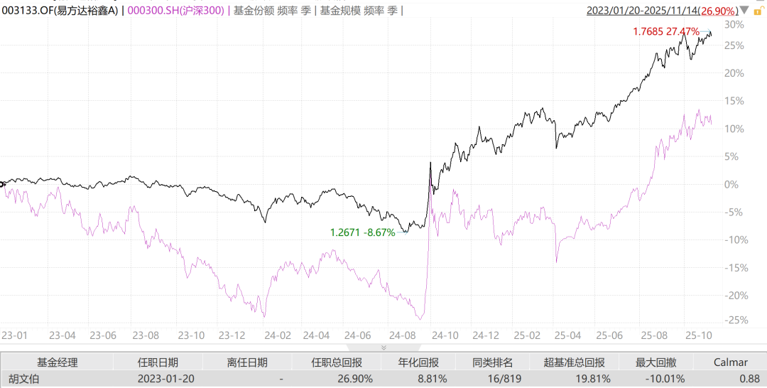 胡文伯依靠转债资产,用40%的仓位和只有一半的回撤,拿到了类似沪深300指数的收益,这种产品很难被筛出来,因为我们通常在筛固收+的时候,会把仓位超过30%的直接剔除。