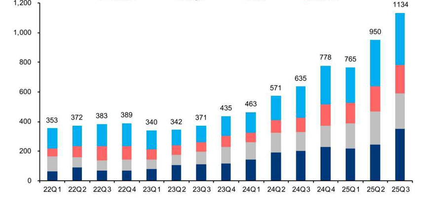 北美四大云厂商2022Q1-2025Q3资本开支(亿美元)