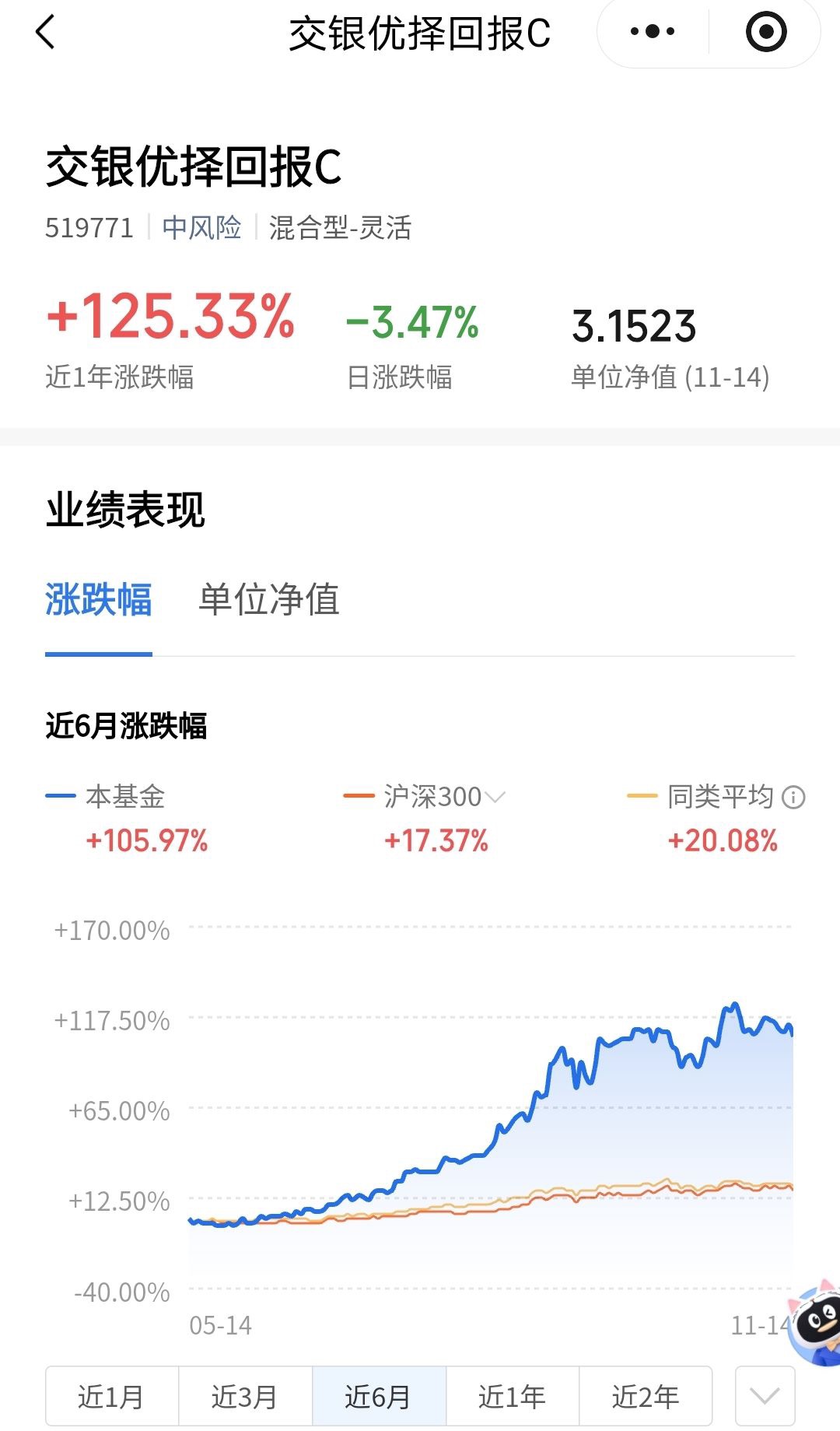 $中欧中证港股通创新药指数发起C$ $东财食品饮料指数增强C$ 交银优择回报C这近1年125.33%的涨幅是真猛,近6月105.97%直接把沪深300的17.37%甩老远。虽然今天小跌一点,但灵活配置的优势在这儿——能跟着高景气赛道调仓,现在踩的方向产业逻辑没断,只要行业热度稳,后续大概率还能冲。
