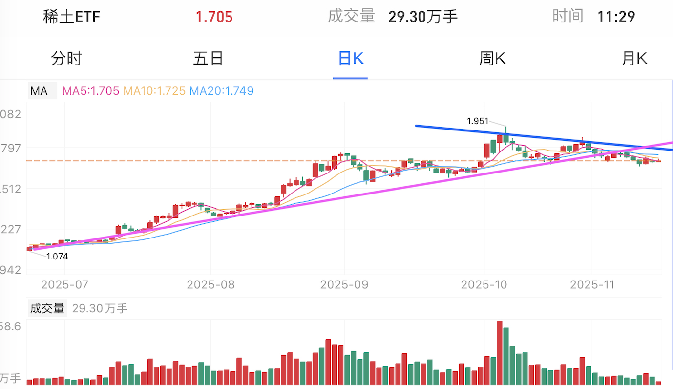 稀土和半导体最近此前也是有一波较大行情,最近力竭盘整,目前跌至前低支撑位,跌破则可能回调下行阶段。