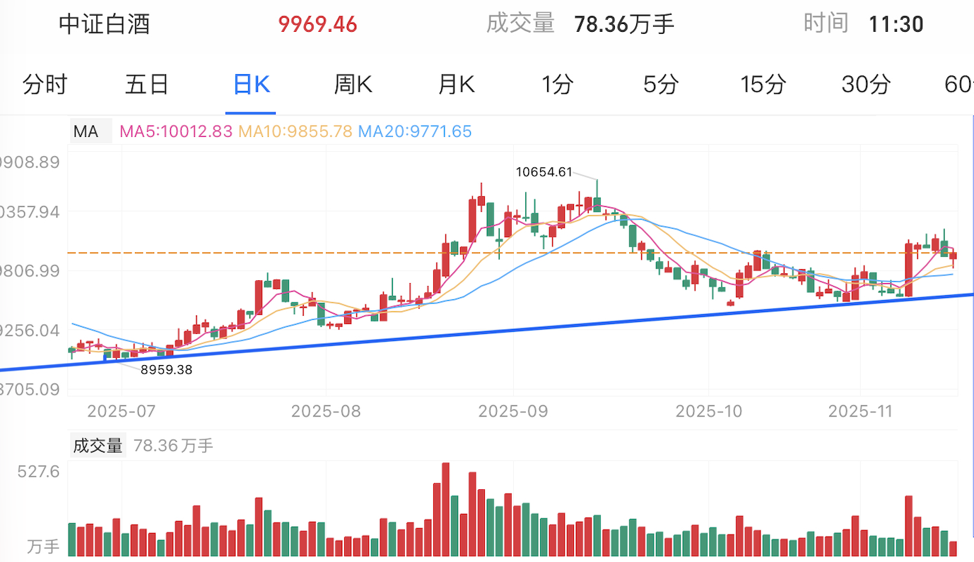 白酒此前短暂反弹,但没能持续涨势,再次回落至前低支撑位,最近再次出现放量反弹,然而上行途中受阻,这几日继续盘整中。