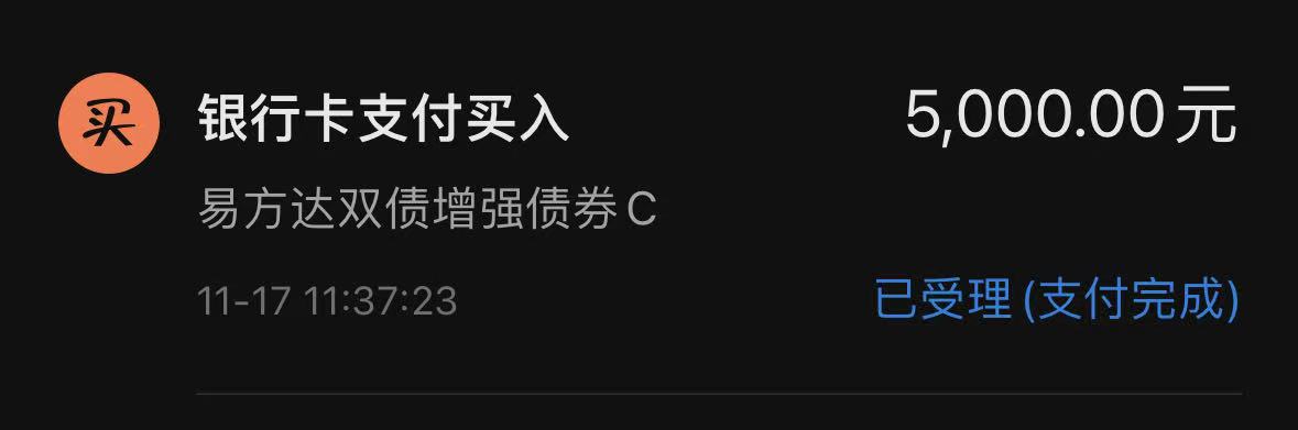 操作一:$易方达双债增强债券C(OTCFUND|110036)$+5000,低波固收+,持仓以0.97%的股票+81.10%的信用债+17.10%的利率债+9.37%的可转债组合而成,债券方面持仓主要集中在银行债和中期票据,银行债具有信用债的稳定性,又有利率债的收益弹性,既能有效降低信用违约风险,又能配合利率债波段操作增厚收益,策略上通过高评级信用债提供稳定票息收益,同时结合少量可转债和权益增强收益弹性,整体波动不大,走势比较温和,回撤控制的比较好,近一个月涨幅0.60%,近一年涨幅5.6%,上证指数上周五天累计下跌0.18%,但是双债增强上周稳住了没有下跌,在上周之前更是已经连涨六周,在震荡市里更体现出低波策略的稳定性。上周五公布了开展买断式逆回购,资金面相对宽松,利好债市,近期信用债走势也相对稳定,年底求稳配置一些稳健的仓位,继续买入5000.
