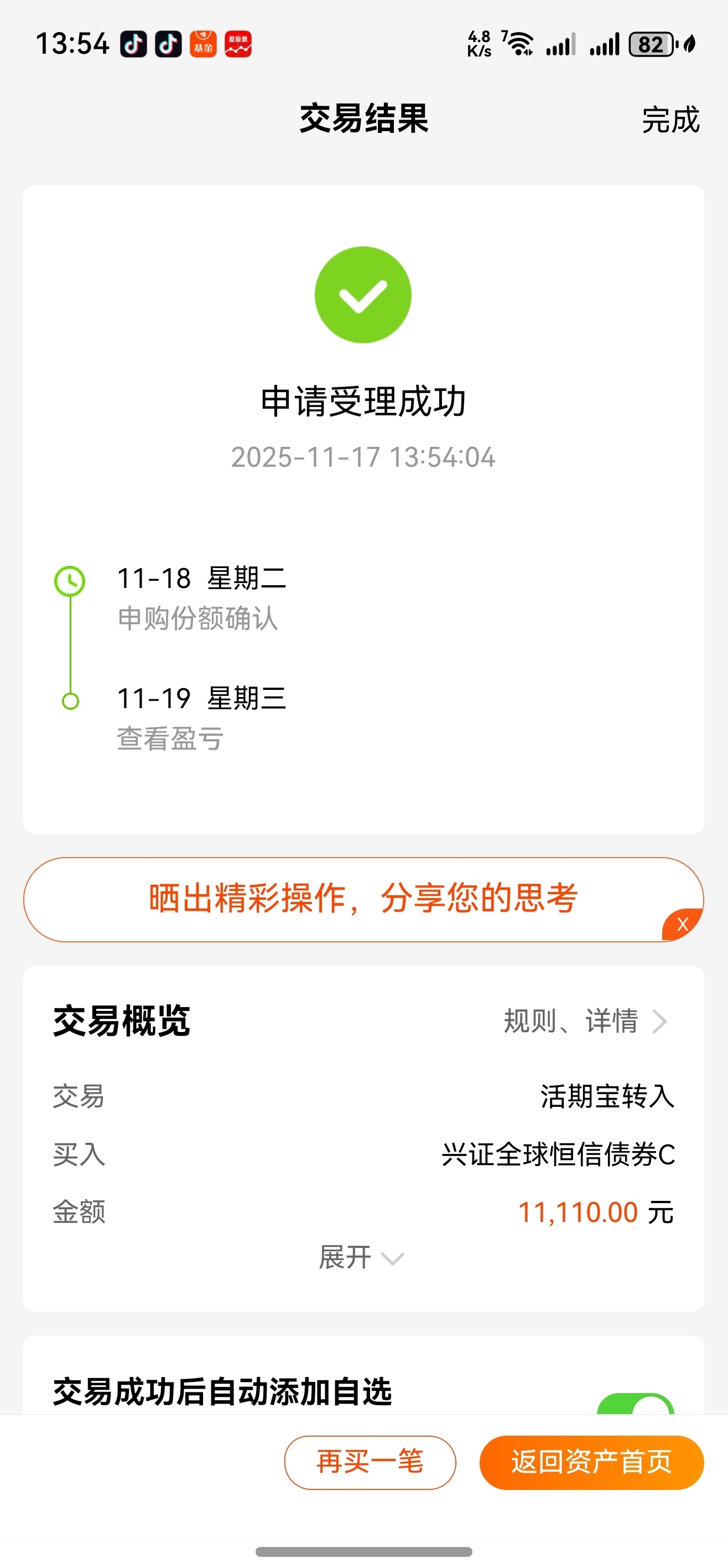 在今天,选择加仓一个整份额资金的某证全球恒信这个债基。