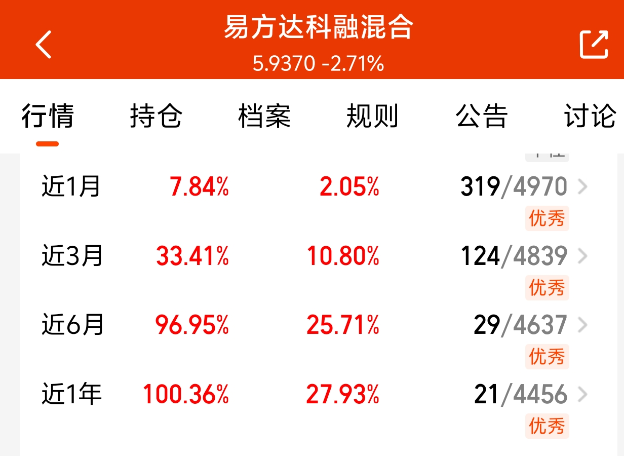 今天市场行情相对来说,还是非常不错的,虽说冲高回落。但是下午盘面又是还是非常强的,一路上升。期待尾盘可以拉红哦!$易方达科融混合$ 易方达科融近三个月涨幅33.41%,近一年涨幅100.36%,其业绩真是没得说,易方达科融主要投资科技、新能源、军工等,配置上真可谓是攻守兼备,经理的择时操控能力也非常优秀,逢低布局,会有意想不到的惊喜