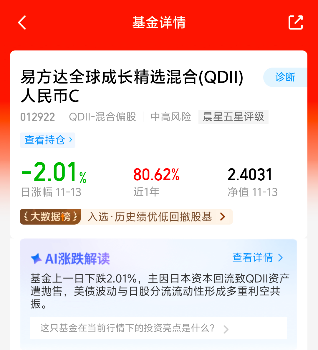大盘今天震荡调整,港股也回调了,美股上周五也回调了,近期市场波动比较大,易方达全球成长精选混合C持仓可投全球科技板块,灵活把握美股、A股和港股科技成长机遇,近六个月涨了73.06%,回撤也控制的不错,看好这个方向,我准备分批加仓了!