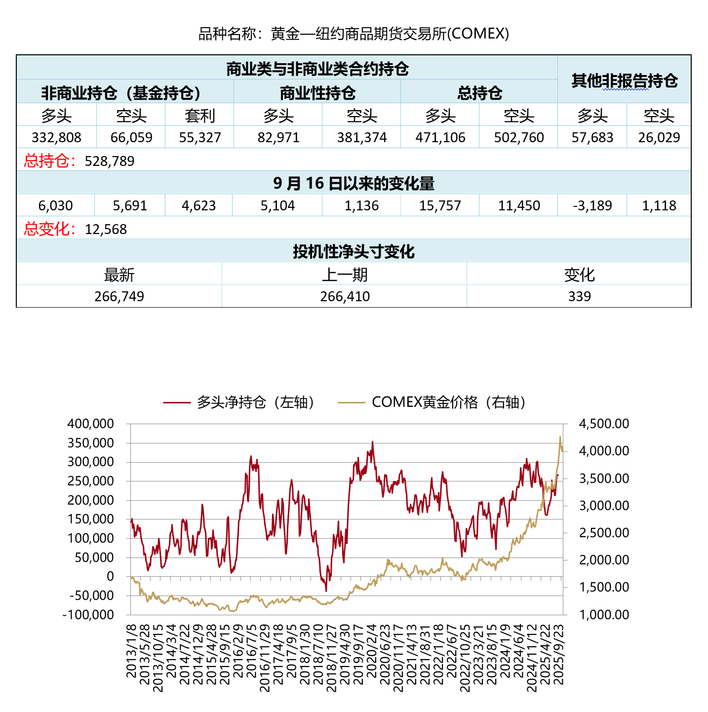 最近一期公布的美国商品期货交易委员会(CFTC)9月23日黄金持仓数据显示:COMEX黄金投机净多头头寸由上一期(9月16日)的266,410手上升至266,749手,净多头头寸增加。