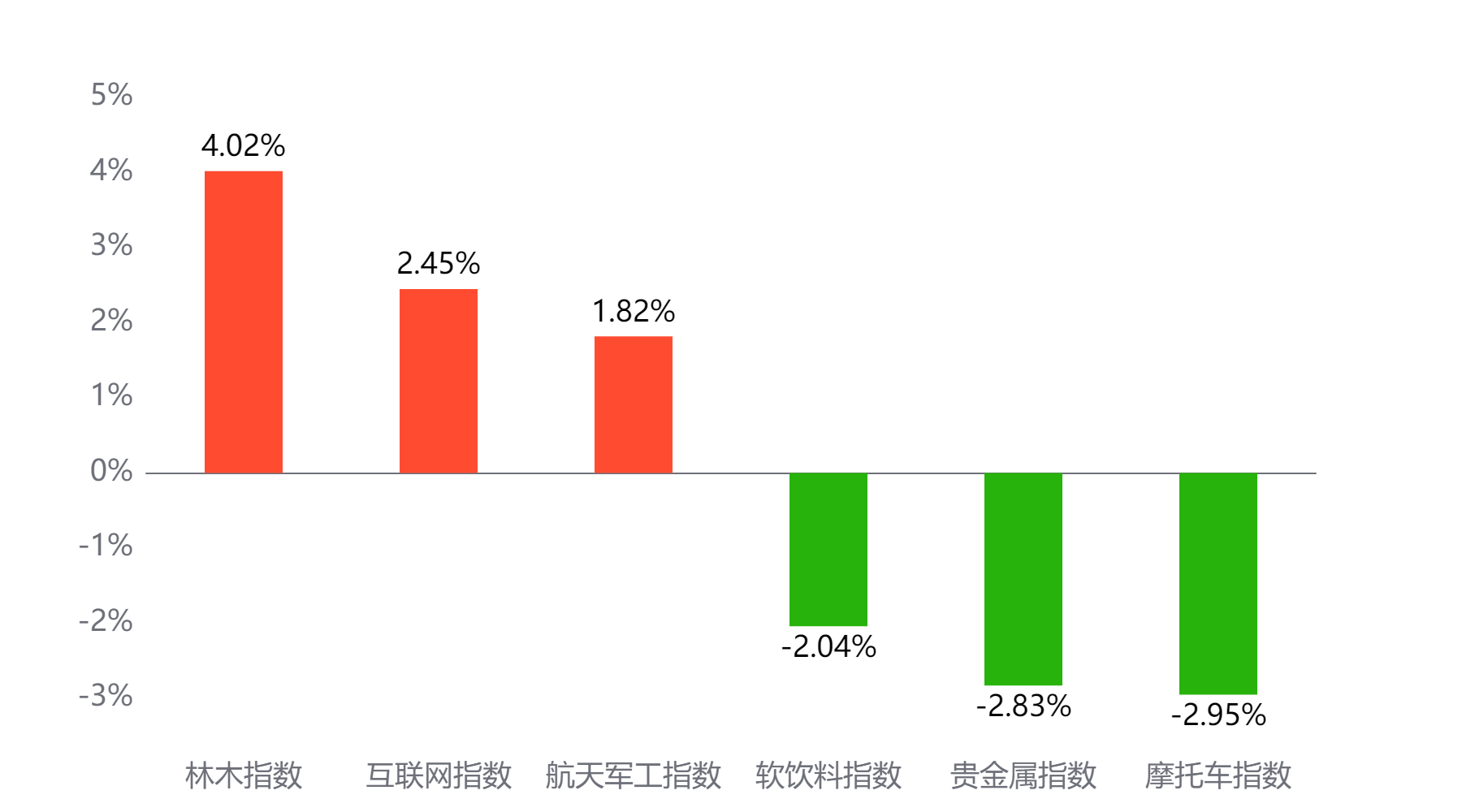 今天表现最好的主题概念依次为林木、互联网、航天军工,表现最差的依次为软饮料、贵金属、摩托车。