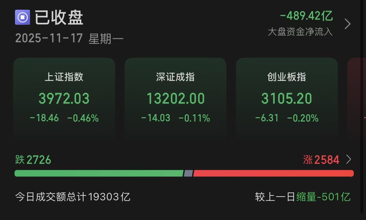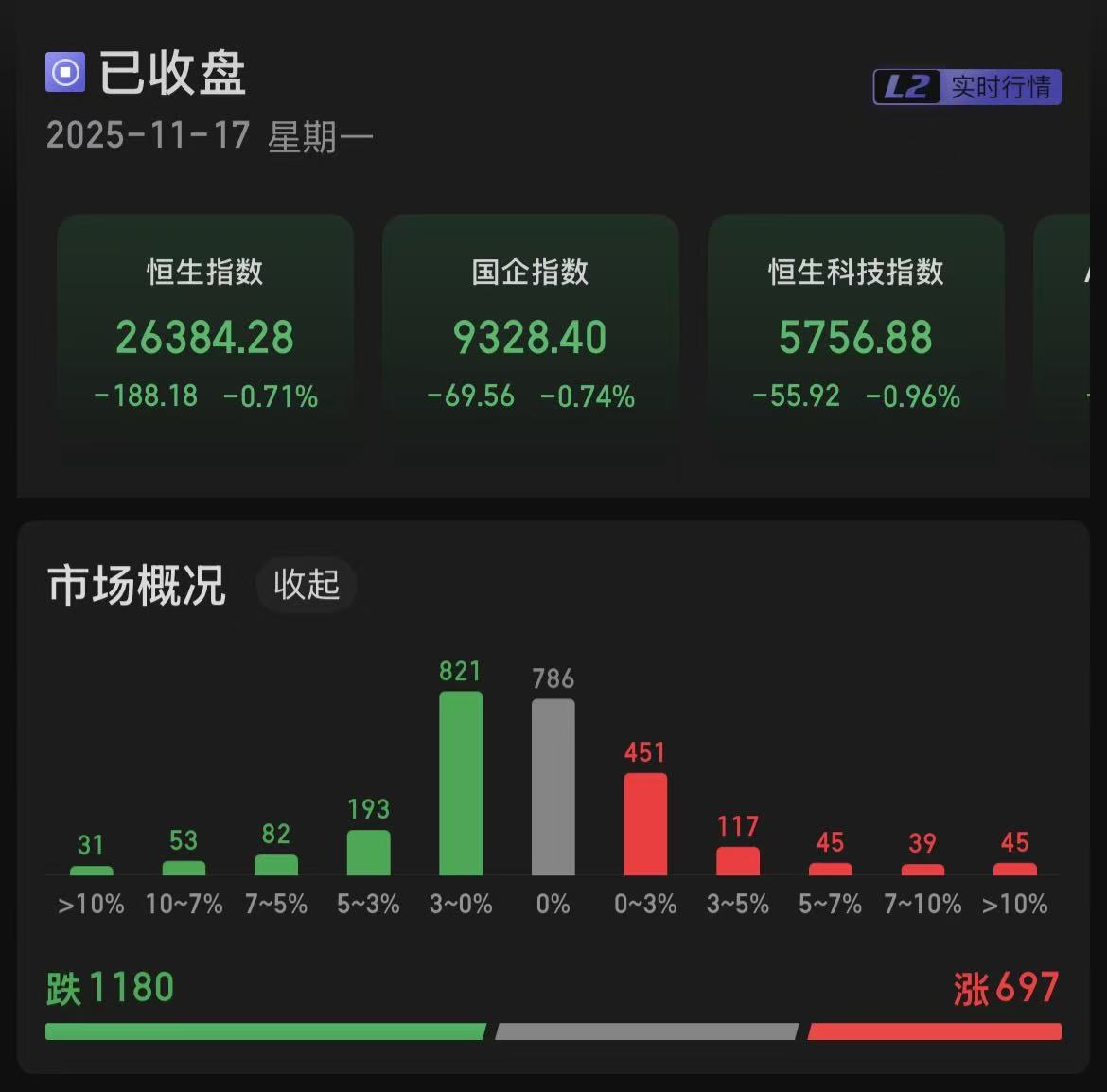 11月17日,A股市场三大指数齐跌,市场呈现 "指数震荡下行、个股风险集中释放" 的特征。开盘后在银行等权重板块护盘下,沪指一度试图企稳,但随两融资金加速撤出,前期热门科技题材股大幅回调,市场赚钱效应快速恶化。午后跌停个股增多,恐慌情绪蔓延,最终主要指数均以绿盘报收。港股市场集体下行,受到外部关系紧张的影响,航空、旅游板块跌幅居前,热门中概股普遍下跌也影响今日港股市场情绪,特别是科技股造成压力。