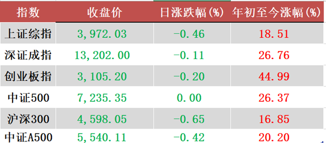 国内主要股指普跌。截至收盘,上证指数跌0.46%,收报3972.03点;深成指跌0.11%,报13202点;创业板指数跌0.2%,收报3105.2 点。两市成交额19107亿元。行业方面,申万一级涨跌互现,计算机领涨,涨幅为1.67%;医药生物领跌,跌幅为1.73%。