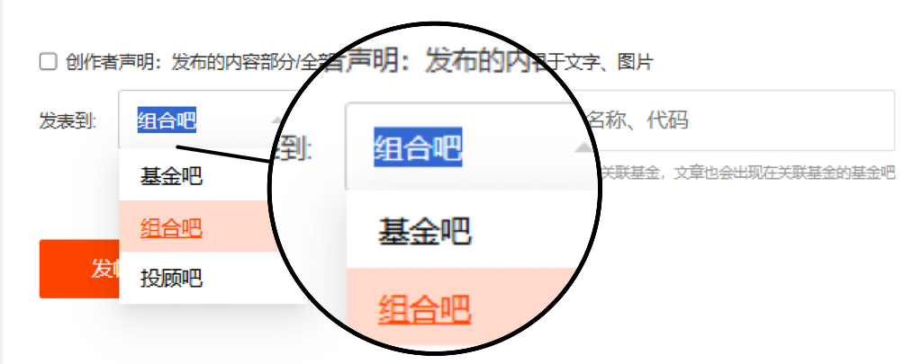 使用天天基金创作平台电脑端(https://fundcreator.eastmoney.com/),除正文中关联基金同步至讨论区外,可选择文章发表到指定的基金吧、组合吧,以及投顾吧内。