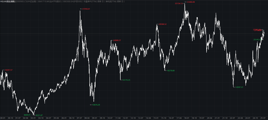 进入21世纪后,恒生指数经历了5轮大的熊-牛周期,每个周期平均5年左右。
