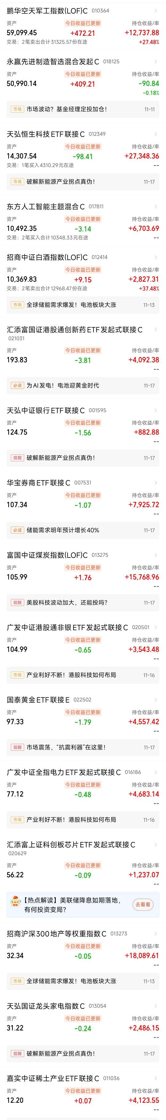 $永赢先进制造智选混合发起C$ $鹏华碳中和主题混合C$ $汇添富国证港股通创新药ETF发起式联接C$ $东方人工智能主题混合C$ $华泰保兴安悦债券C$ $广发中证港股通非银ETF发起式联接C$ $天弘中证银行ETF联接C$ $国泰黄金ETF联接E$ $广发纳斯达克100ETF联接人民币(QDII)C$ $汇添富上证科创板芯片ETF发起式联接C$ $嘉实中证稀土产业ETF联接C$ $华安北证50成份指数发起式C$ $鹏华空天军工指数(LOF)C$ $招商中证白酒指数(LOF)C$ $广发中证全指电力ETF发起式联接C$ $天弘国证龙头家电指数C$ $华宝券商ETF联接C$ $富国中证煤炭指数(LOF)C$ $天弘恒生科技ETF联接C$ $招商沪深300地产等权重指数C$