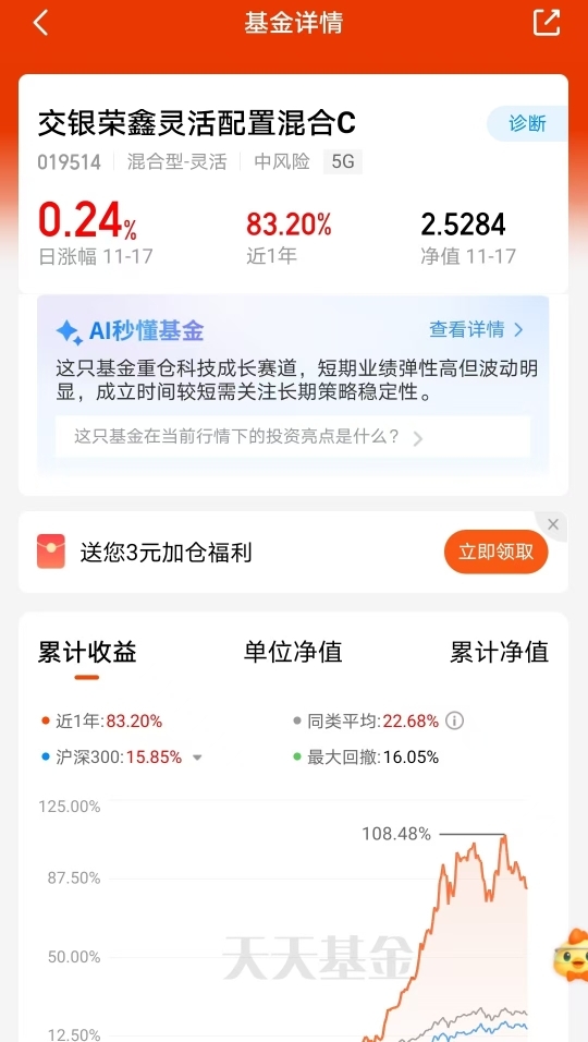 交银荣鑫C这数据够亮眼:近1年83.20%、近6月85.12%的涨幅,直接把沪深300的18.23%甩得没影。灵活配置的优势太明显,能跟着高景气赛道调仓,不用死扛单一板块。今天还涨了0.24%,只要它踩的赛道产业逻辑没断,后续接着吃行业红利的节奏应该能稳住。