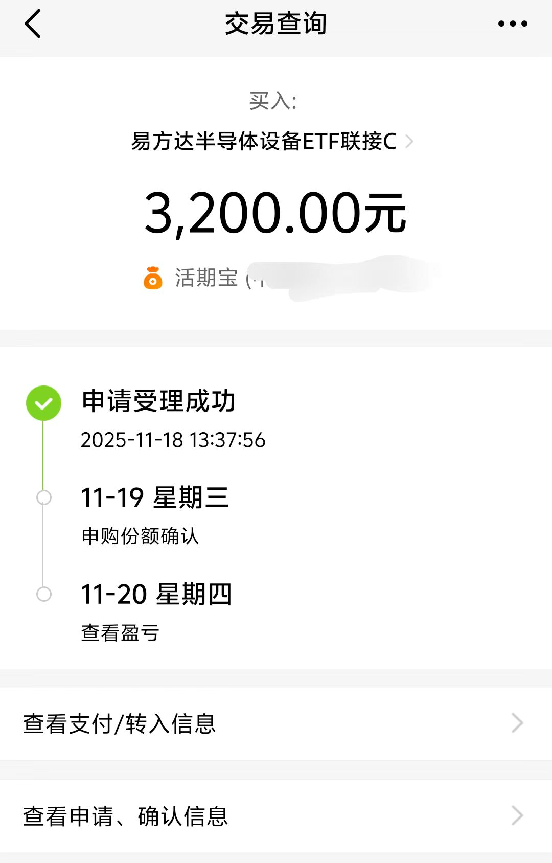 大盘今天震荡调整,半导体设备今天逆市领涨,今天涨幅超2个点,半导体设备受益于全球数字化浪潮和国产替代双重驱动,发展前景还是很广阔的,长期看好这个方向,今天加仓易方达半导体设备ETF联接C3200元!