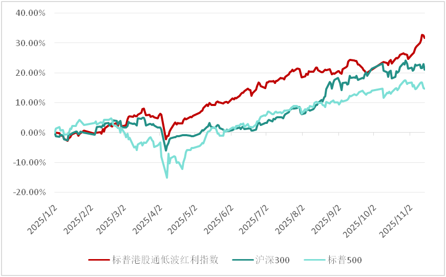 在全球市场波动加剧与利率持续下行的背景下,兼具高股息与低波动特性的港股红利资产四季度正成为资金追逐的焦点。截至2025年11月16日,标普港股通低波红利指数年内涨幅接近31%,显著超越同期标普500指数与沪深300指数(涨幅分别为约14%和约21%)。这一表现不仅印证了港股红利资产在震荡市中的防御优势,更凸显其作为四季度资产配置刚需的价值。