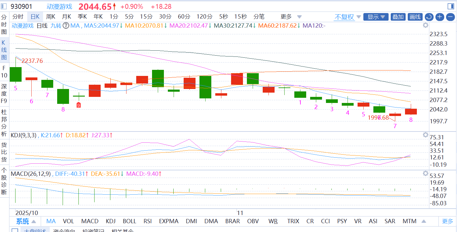 游戏板块:麦爸认为板块受阿里“千问”上线催化逆上涨,成交量温和放大,日线KDJ接近金叉,出现止跌企稳迹象。麦爸选择持仓观望。