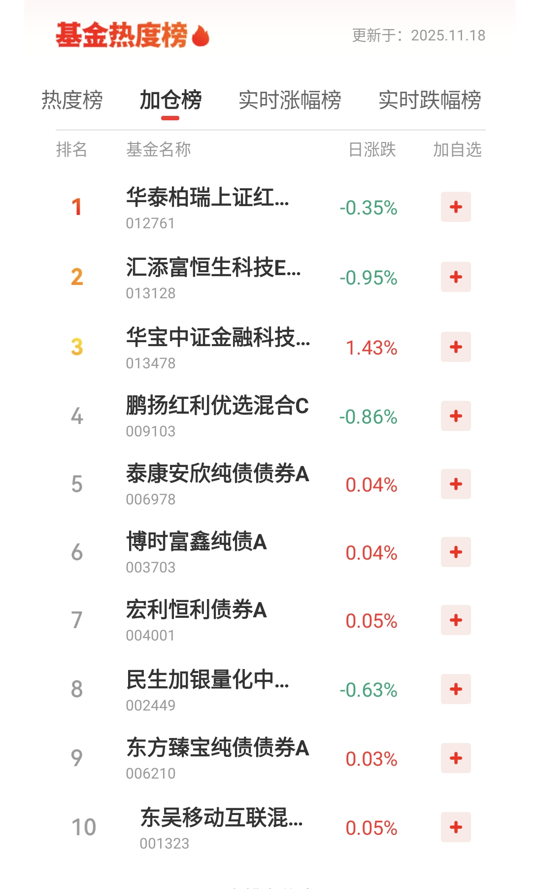 11月18日基金热度榜,加仓榜,实时涨跌幅榜