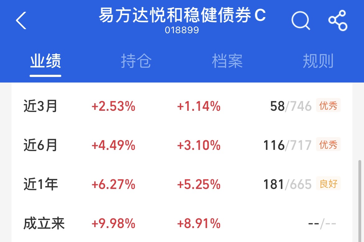 今天加仓易方达悦和稳健债券C,这只固收+产品近三月收253个蛋,近一年收益率达6