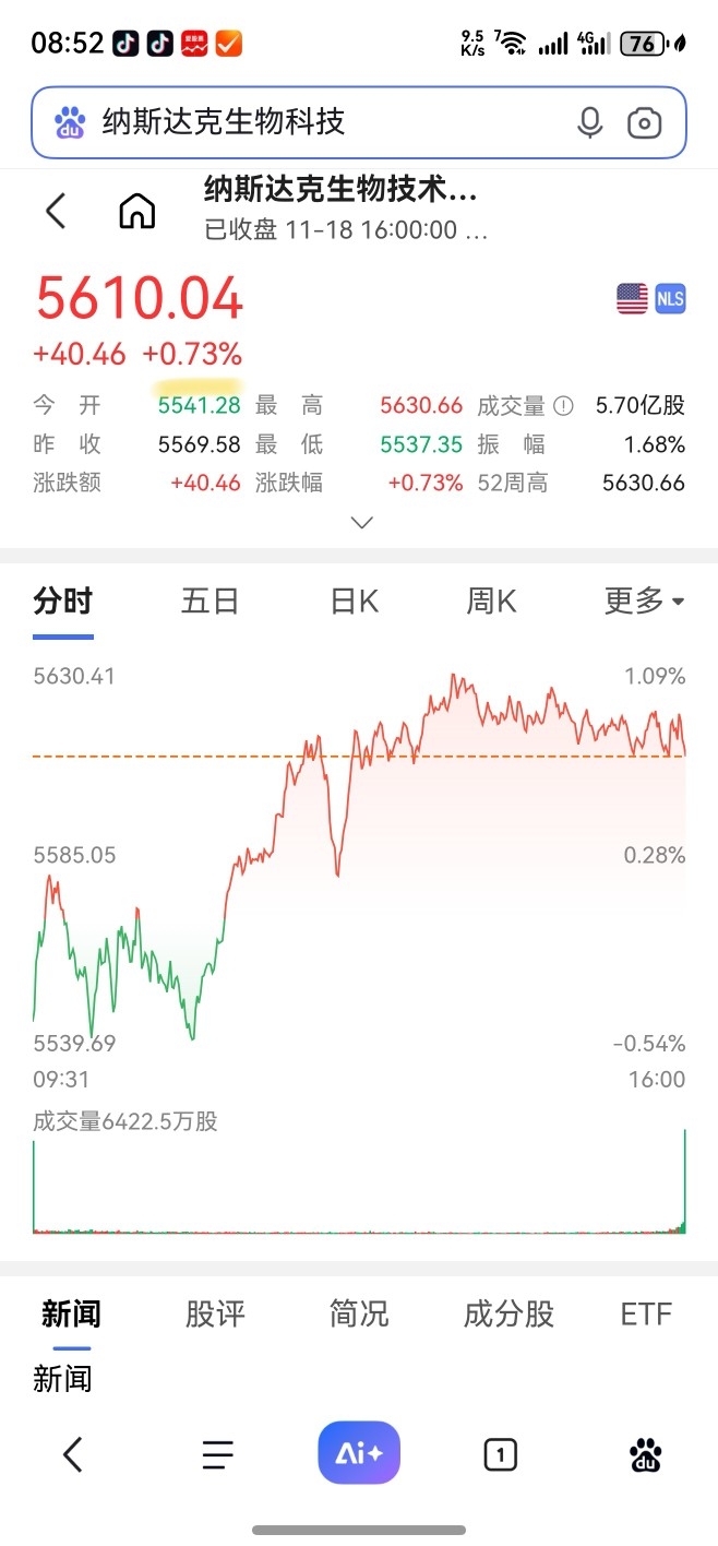 在用手机游览器,再次搜索纳斯达克100指数、纳斯达克生物科技指数,这两个指数数据,也的确是变少跌了、与变来个大反转变涨了。