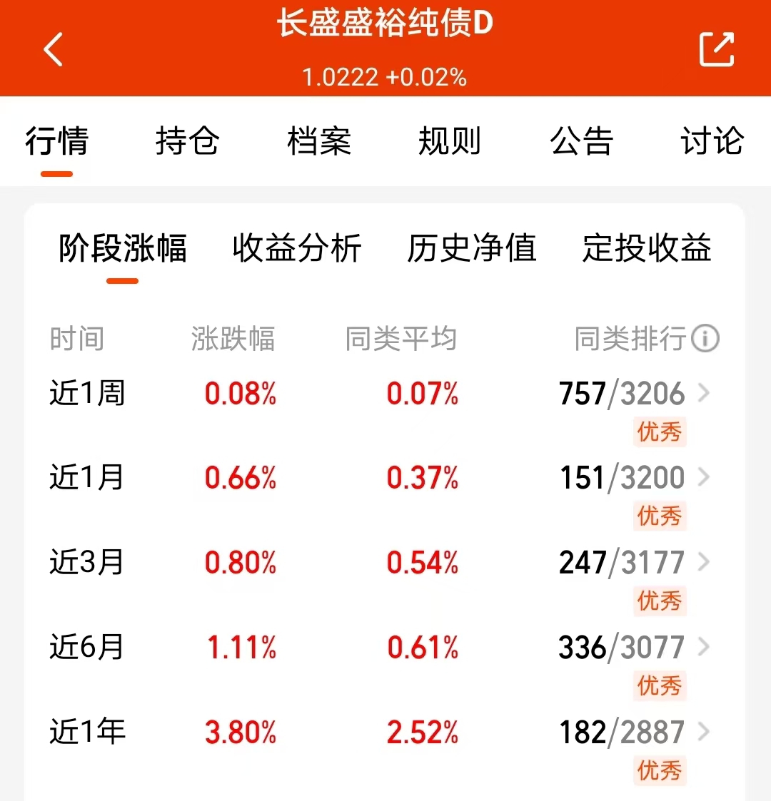 我每月工资剩下的闲钱,放余某宝收益太低,长盛盛裕纯债D太合适了!近1年收益3.8%,长期跑赢同类平均,业绩是真能打。它不投股票,专注国债、金融债这些固收资产,波动小抗风险强,机构持有比例还高,安全性直接拉满。而且这产品马上要限购了,属于稀缺好标的,我特别看好它的稳健表现,打算赶紧布局一波。