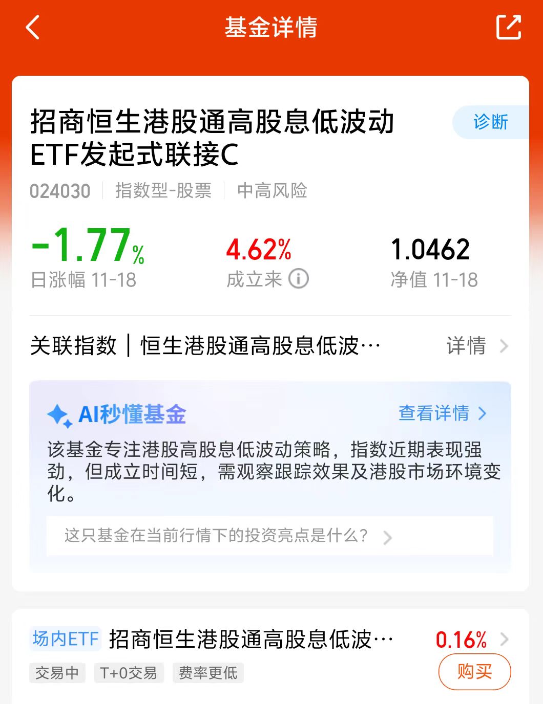 大盘震荡调整,港股今天也回调了,近期市场波动比较大,红利板块防御性不错,港股红利低波ETF股息率6%,资金近期持续流入港红利板块,金融地产权重超60%,比较稳一些,作为持仓中的压舱石很不错,我准备分批加仓$招商恒生港股通高股息低波动ETF发起式联接C(OTCFUND|024030)$了!