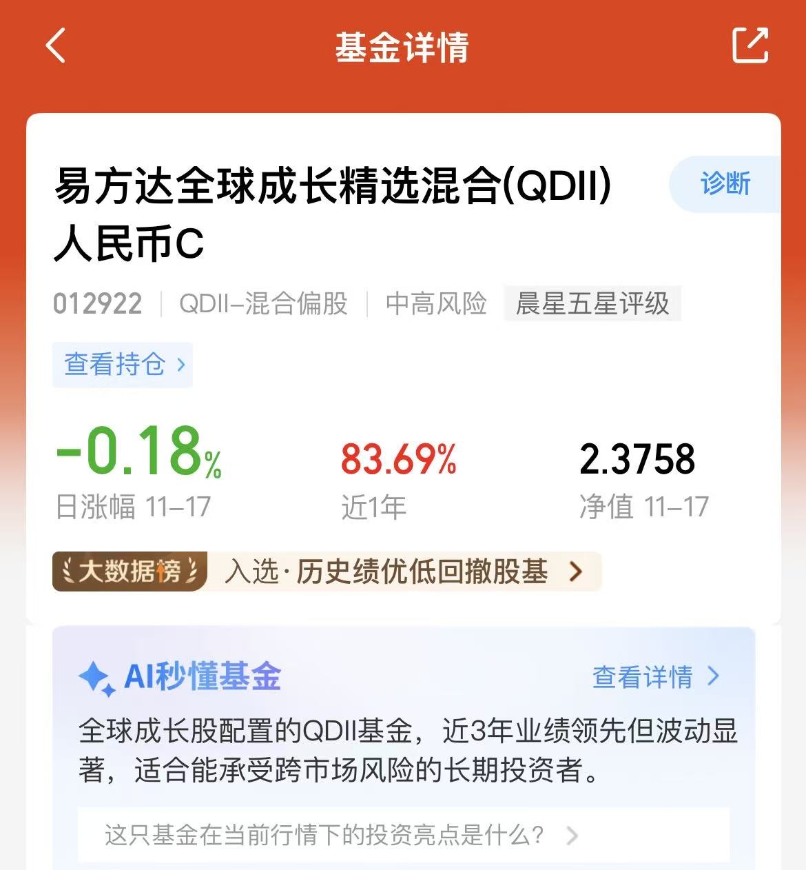 昨夜美股继续调整,今天A股和港股也高开低走,盘面是比较难呢,又是吃面的一天,近期频繁震荡调整,我觉得还是多市场布局会更好一些,这样能更好的把握机遇。$易方达全球成长精选混合(QDII)人民币C(OTCFUND|012922)$我持有的时间比较长了,收益也不错,这也是投资A+H+美股科技板块为主的,年化收益率83.69%,业绩出色,长期来看不错呢。#全球股市集体下跌 你怎么看?# #工信部推动算力建设!算力股机会来了?##观点搭子团火热招募中!#