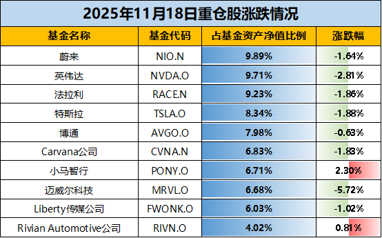 【十大持仓】根据最新披露的基金定期报告,截至2025年三季度末,华宝海外新能源汽车前十大重仓股包括蔚来、英伟达、法拉利、博通、特斯拉、Carvana公司、小马智行、迈威尔科技、Liberty传媒公司、Rivian Automotive公司,占基金资产净值比例合计为75.42%。