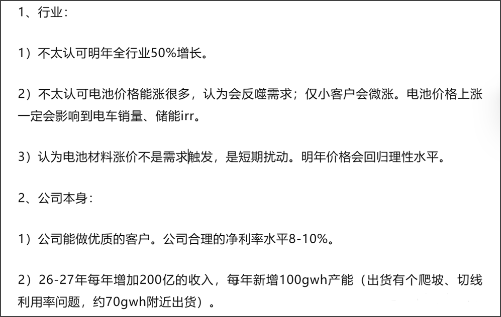 虽然董事长提前披露公司未来两年的产能出货数据这种事槽点颇多,不过我们重点不在这里。相比之前的炸裂指引,董事长对行业的看法总体是比较冷静客观的。当然也可以理解成电池厂和材料厂谈长协长单价格了,不想把需求说的太好,要不然材料价格要上天,经历过20-22年锂电的懂的都懂。所以今天资金开始兑现涨价预期,避险现实碰撞了。