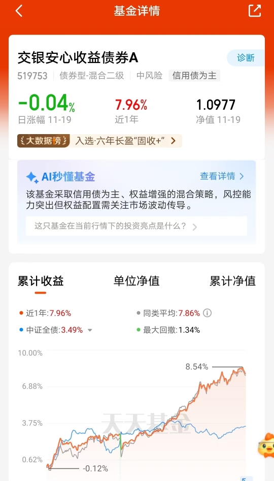 这近1年7.96%的收益真不错,比同类平均和中证全债都强,还挂了“六年长盈”的牌子。信用债打底稳得住,权益增强能提收益,风险控制也在线,最大回撤才1.34%。只要信用债基本面稳,权益端再蹭点行情,这只“固收+”后续的稳收益节奏值得看好。