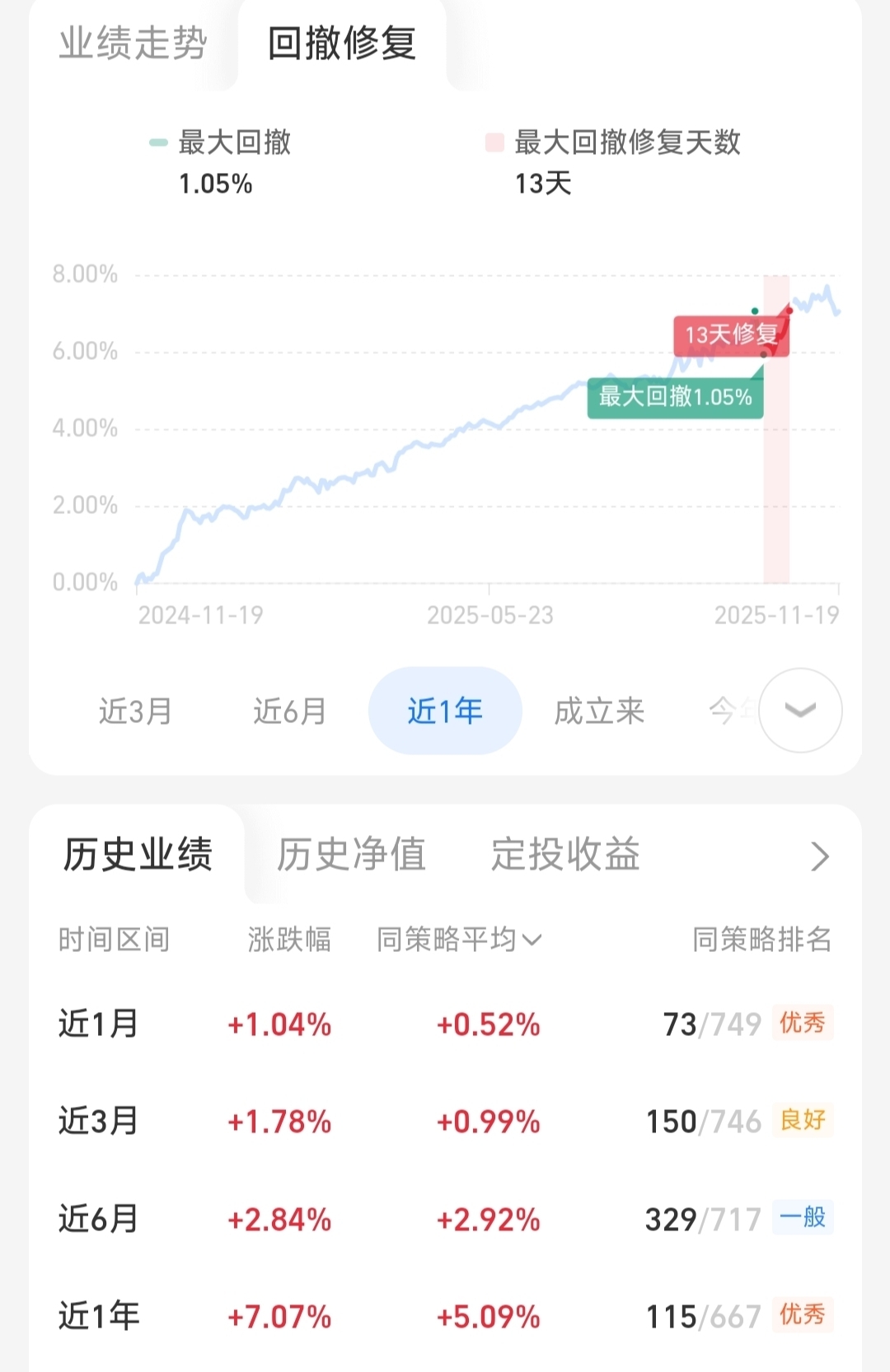 昨天大部分混债丢了蛋,但我持仓的兴证全球招益还逆势收蛋了。我今天再补8千进来,这种震荡市配置这种能涨抗跌的我才安心。从业绩和回撤波动来看,招益都很优秀,近半年涨了2.84%,近一年涨了7.07%了,大幅跑赢同类平均值和国债指数,同类排名都是“优”;严控回撤,最近一年最大回撤才1.05%,仅用13天就完成了修复。我就喜欢这种回调后能快速修复的,懒人理财多爽。它是股债协同策略,以高等级的信用债固底,股票增强,持仓股行业分布广泛,有效降低了回调风险。现在权益类三天两头震荡,固收+的配置价值凸显,所以我打算近期重点布局固收+。招益综合表现比较突出,收益稳定性和抗波动能力均强,我把钱投这里放心,主要不用我自己盯盘,很省事。