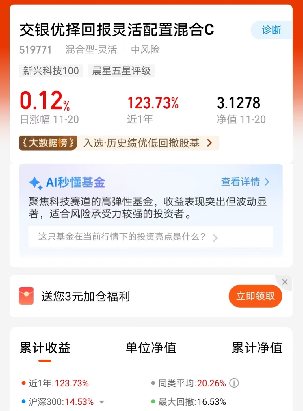 上周看到医疗和碳中和板块轮动加速的新闻,突然理解了我这只“神基”的操作逻辑——近一年123.73%的涨幅,比同期沪深300和同类产品高出足足一倍多!这种灵活配置的基金就像变形金刚,行业风口来时迅速变身,震荡时又能敏捷躲坑。虽然不敢说基金经理有预言能力,但人家调仓确实精准,像玩节奏游戏全连击似的。当然我也清楚,历史业绩再猛也不能代表未来,最近市场波动加大,我每天看看净值走势就跟追连续剧似的,既期待新剧情又怕突然虐心。不过持有体验确实不错,账户余额蹦跶得比我健身操还有活力,这种稳稳的幸福值得记在小本本上继续观察$易方达成长动力混合C$ 加把劲$华商均衡成长混合C$ 不错$诺德新生活混合C$ 未来可期
