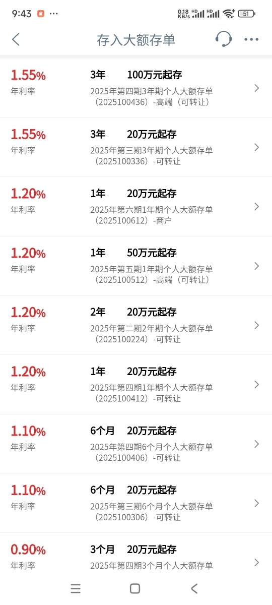 工商银行的APP可以看到,大额存单只有3年期的存款期限的,并且利率只有1.55%,而且这是大额存单的利息。