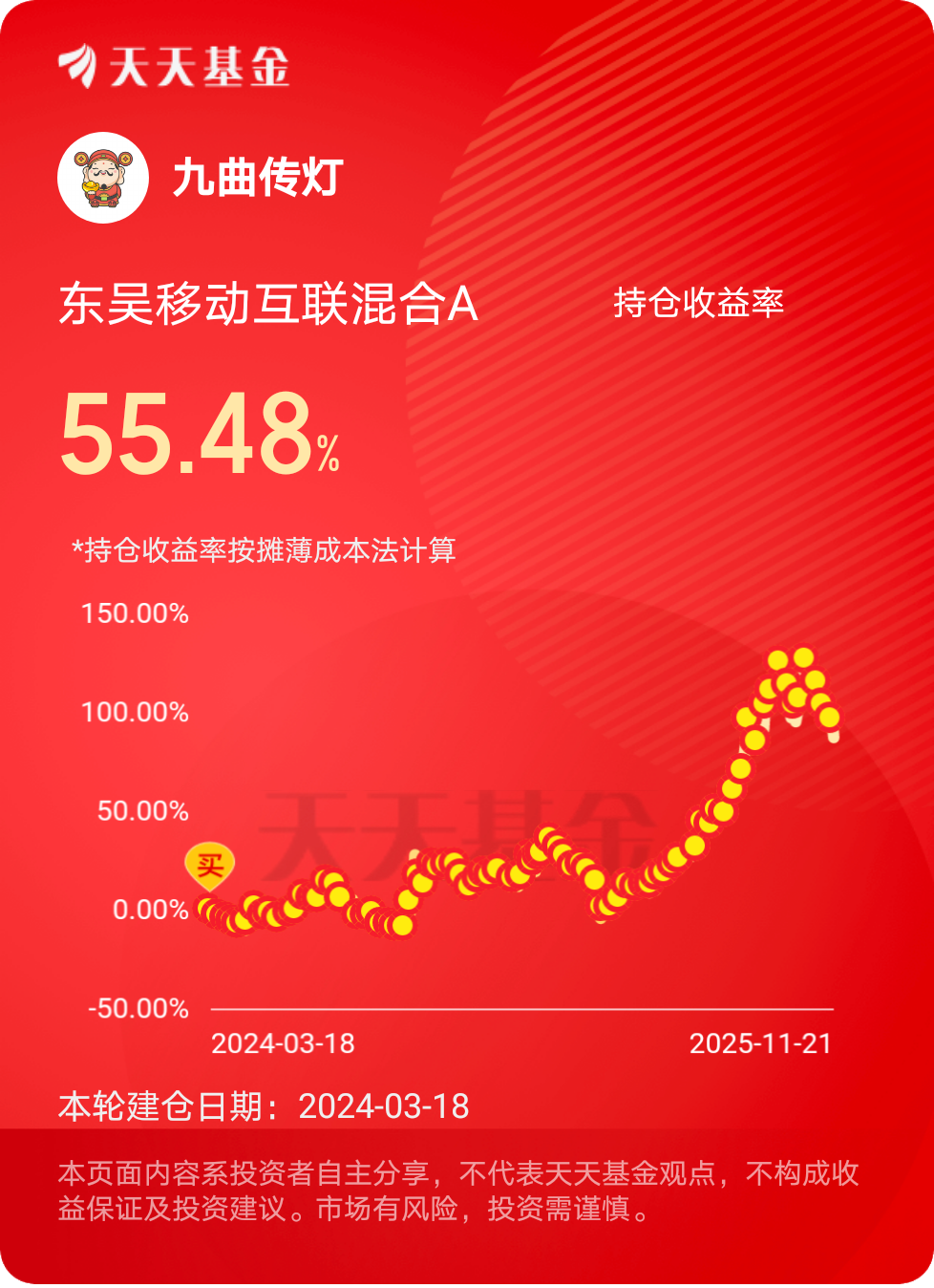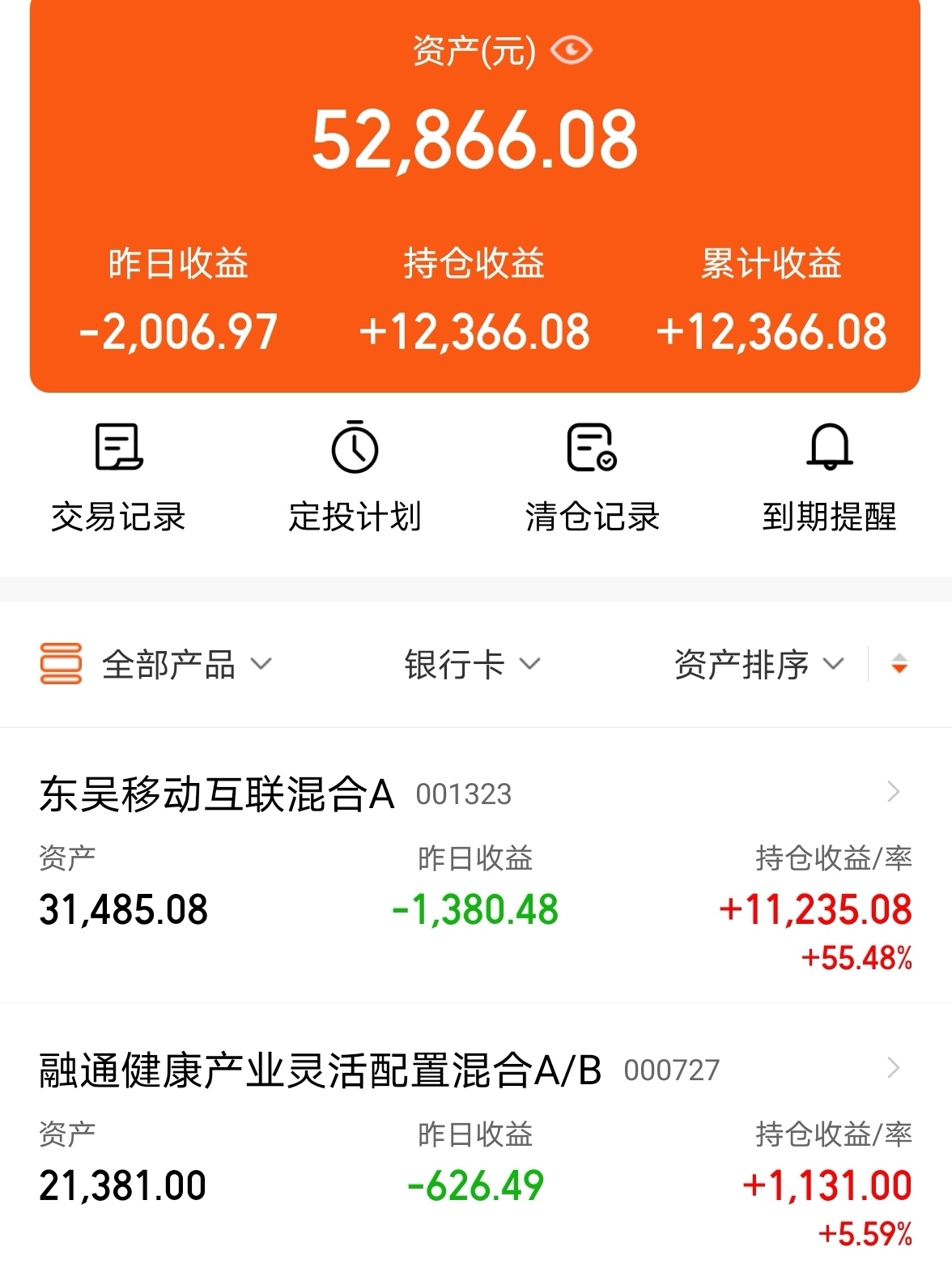 现基金资产52866.08元,盈利12366.08元。其中,融通健康产业收益率为5.59%、东吴移动互联混合A收益率为55.48%。