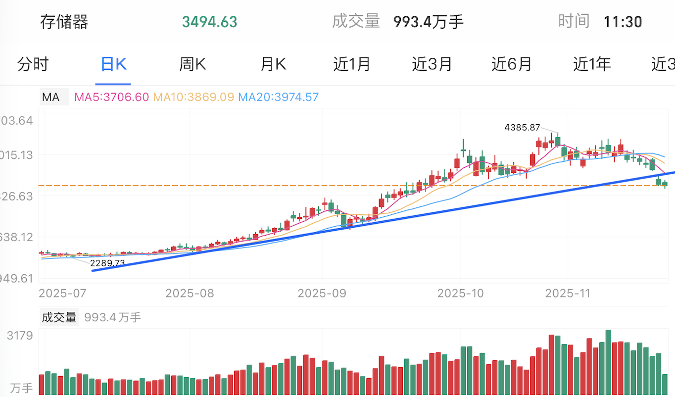 存储芯片:前期是市场主线,涨幅较大,近期在高位回落,并跌破关键趋势线,伴随成交量放大。短期走势偏弱。