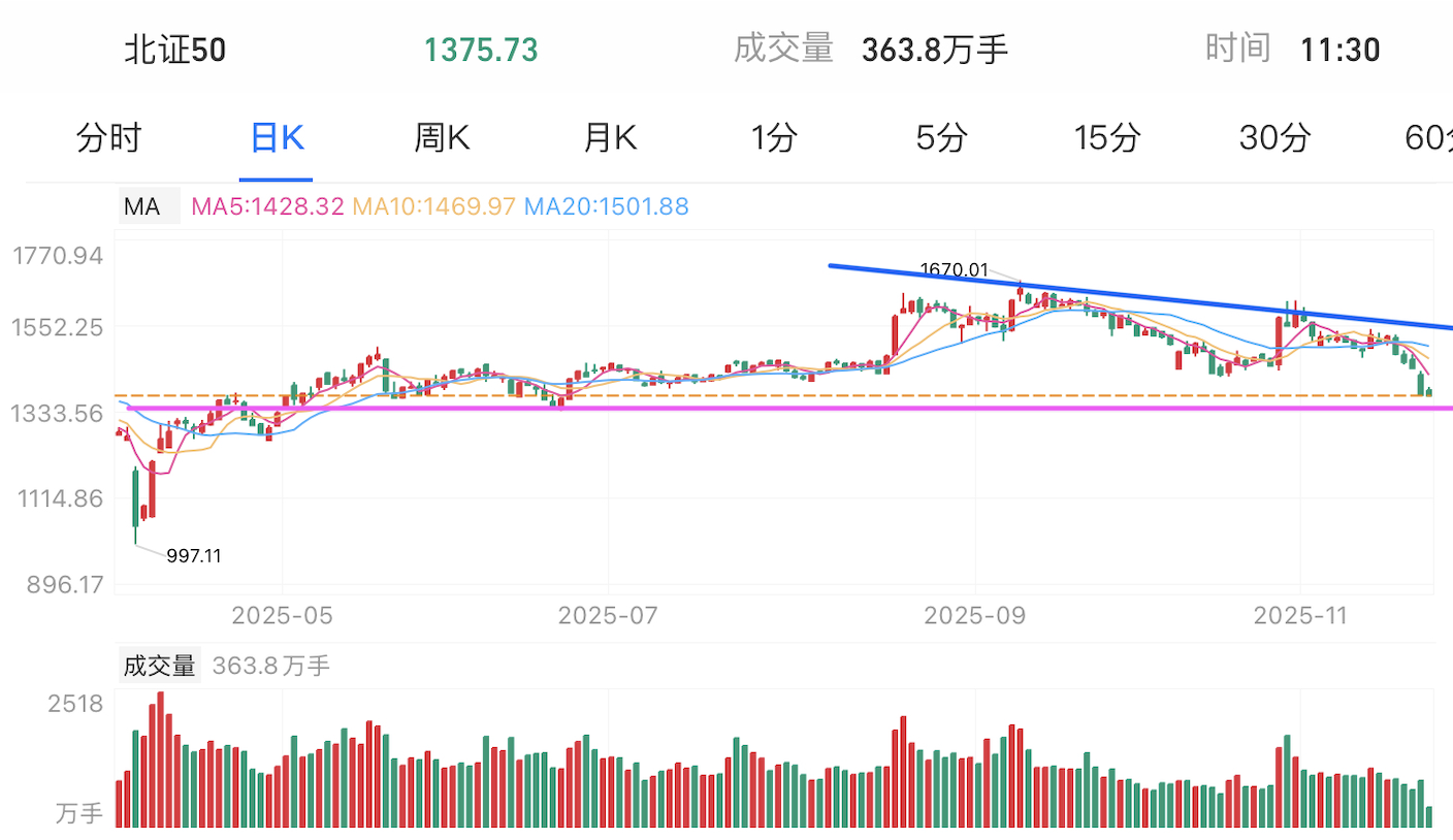 北证50:前期上涨后在高位盘整,近期转头下行并跌至前低支撑位。若继续跌破,则可能进入更深调整。