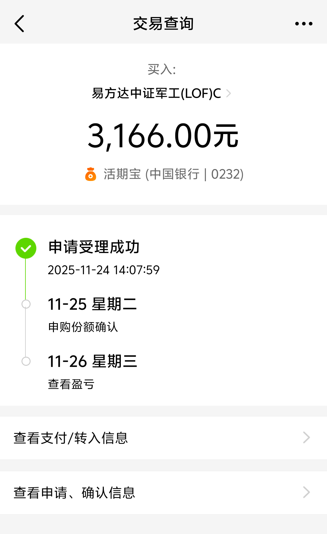 军工指数今天领涨,大盘今天表现还不错,三大指数拉升翻红,军工板块长期来看发展前景还不错,中证军工指数目前涨了3.58%,发展空间还很大,长期看好这个方向,我准备分批布局,今天加仓易方达中证军工C3166元,之后再逢低买入了!