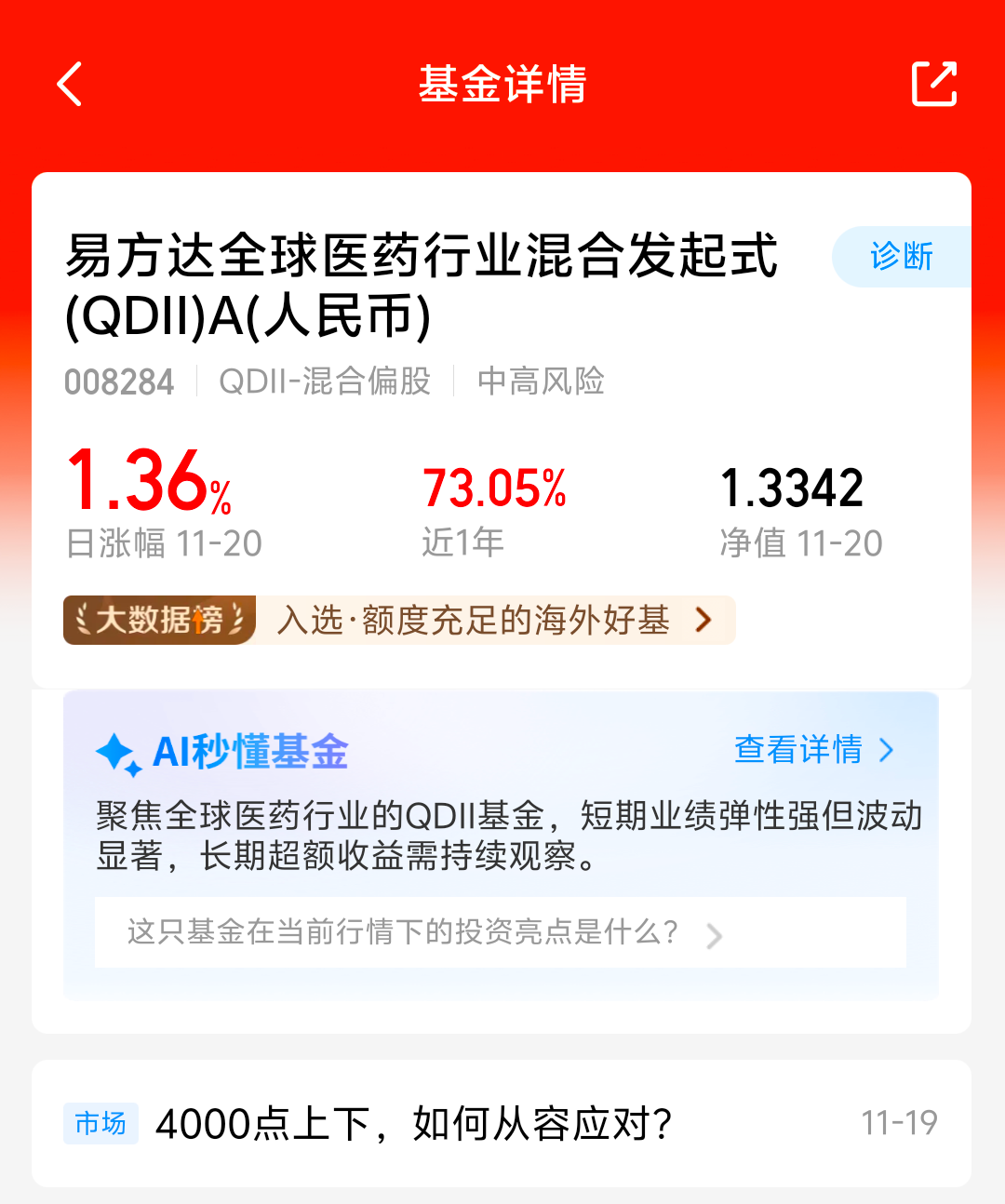 大盘今天回暖上涨,医药板块基本面向好,今天涨了不少呢,近期市场波动比较大,全球市场轮动很快,单一市场风险比较大,易方达全球医药行业混合A持仓可投全球医药板块,灵活调仓,今年来涨了85.25%,业绩不错,看好这个方向,我准备分批加仓!